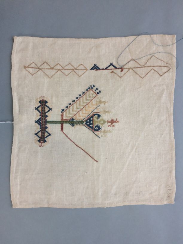 Merklap van linnen, linnen en zijden borduurse met grote levensboom, onaf, ongedateerd