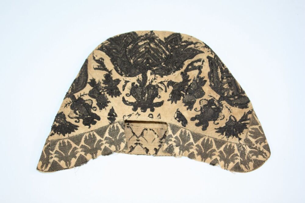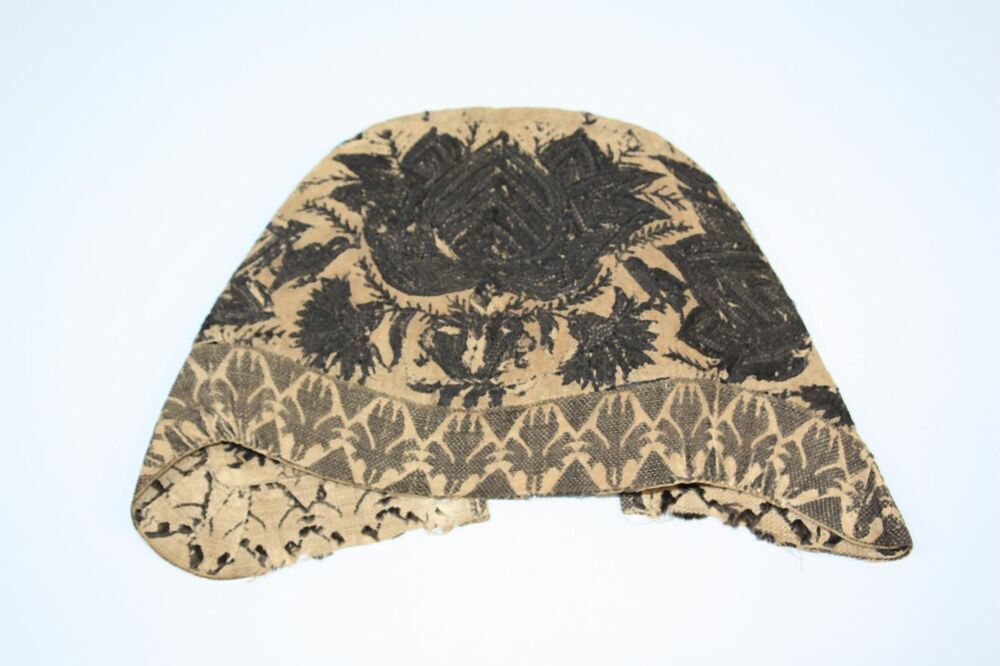 Muts van wit linnen met zwarte geborduurde bloemfiguren en vogels, 1794, afgezet met zwart zijden band