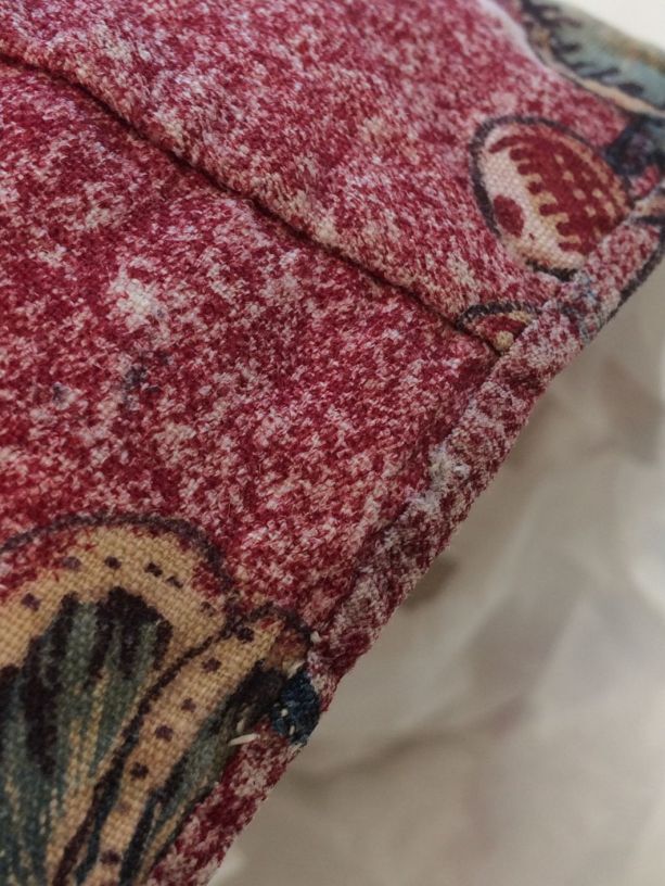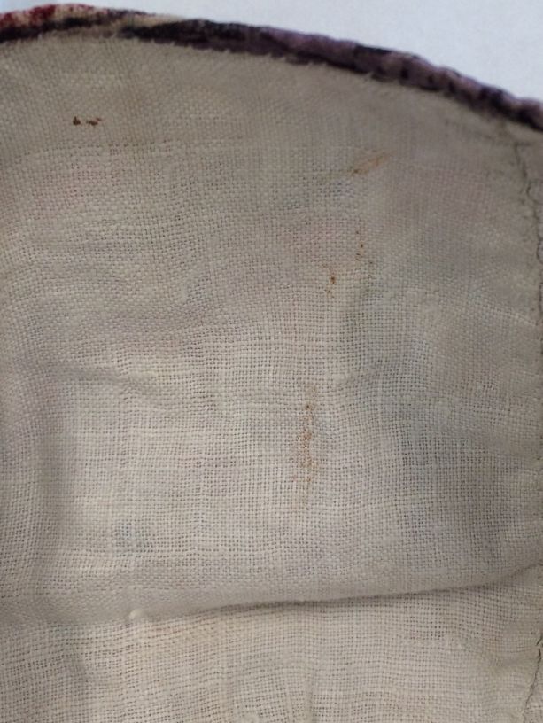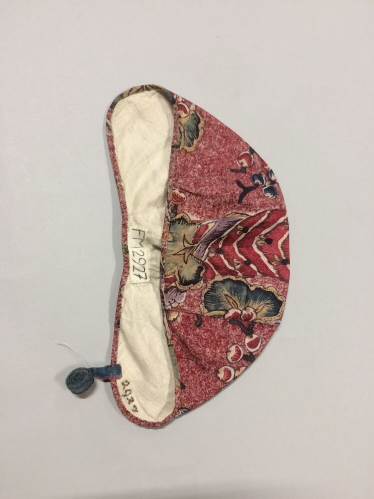 Sitsen meisjesmuts, met rode band met V-vormige strepen, vliegjes en bessentakken op wit-rode grond