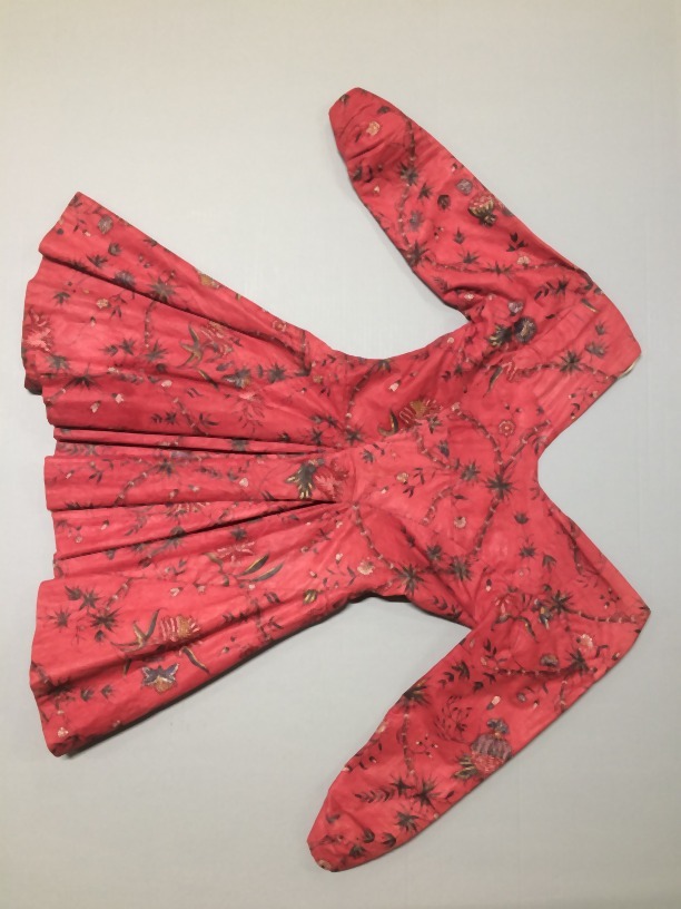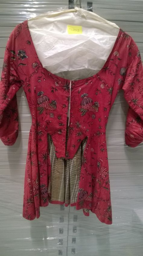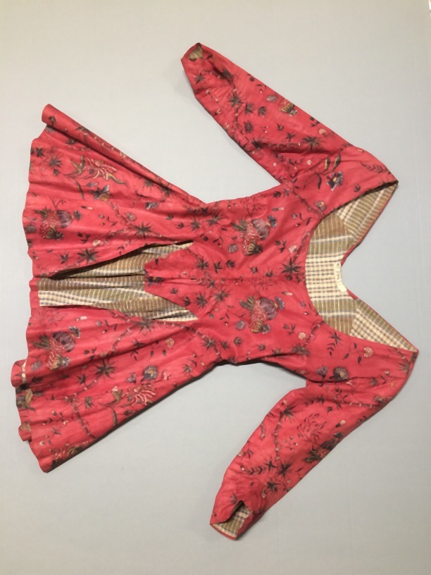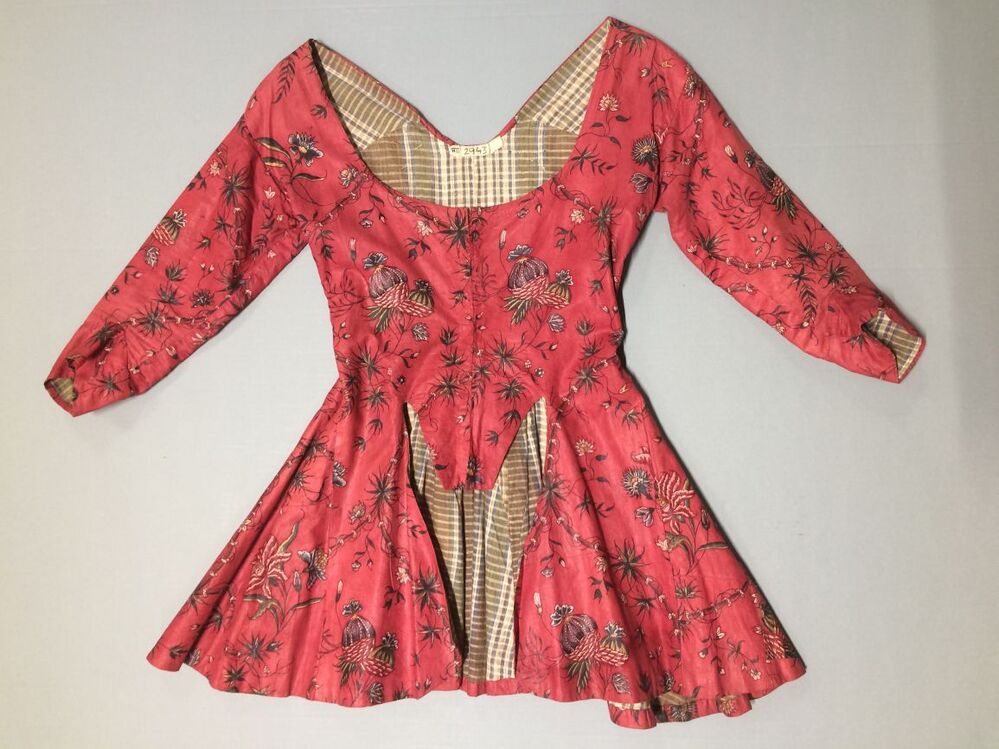 Sitsen vrouwenjak, beschilderd met medaillons gevormd door bamboestengels, waarin diverse boeketjes, op rode grond