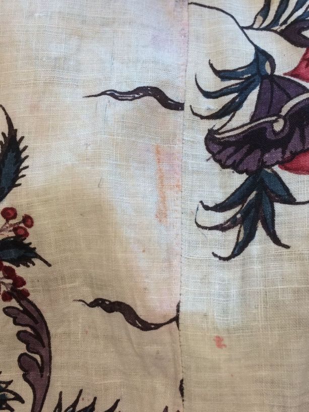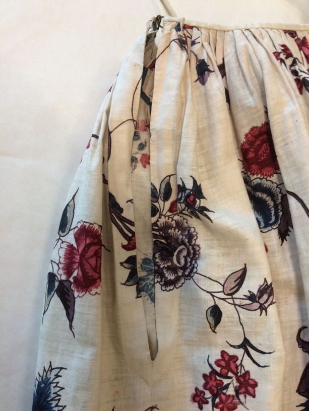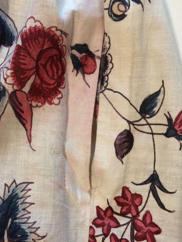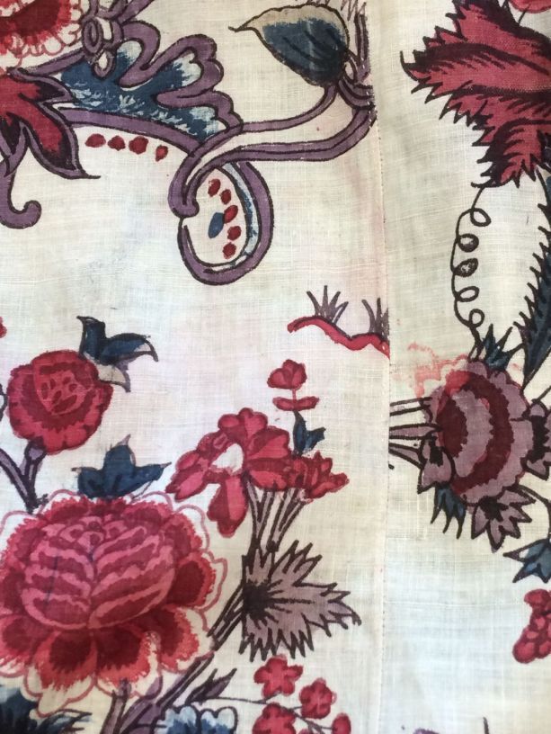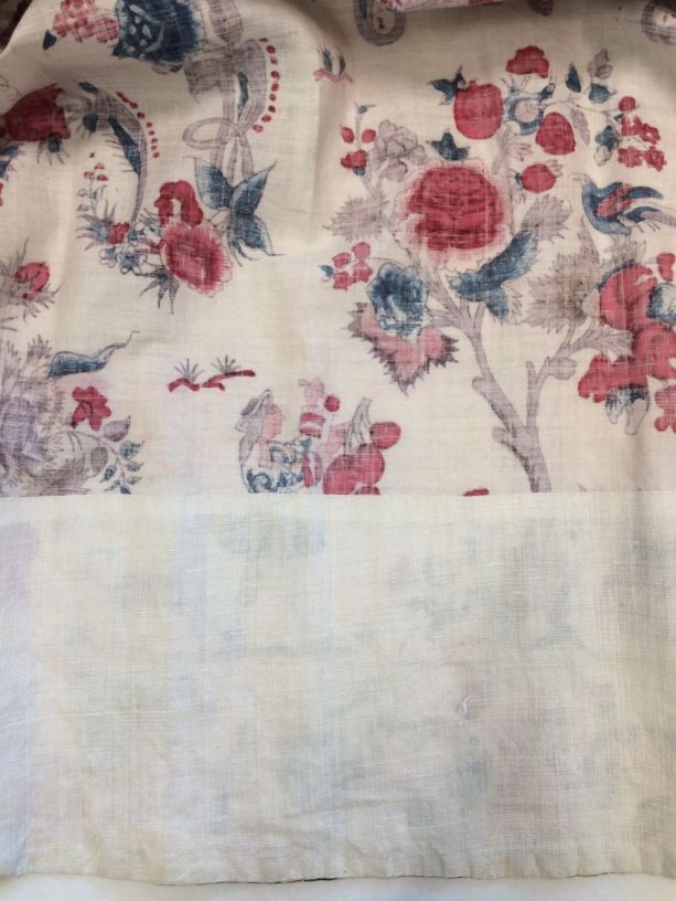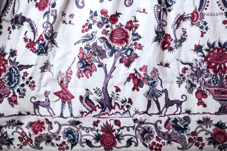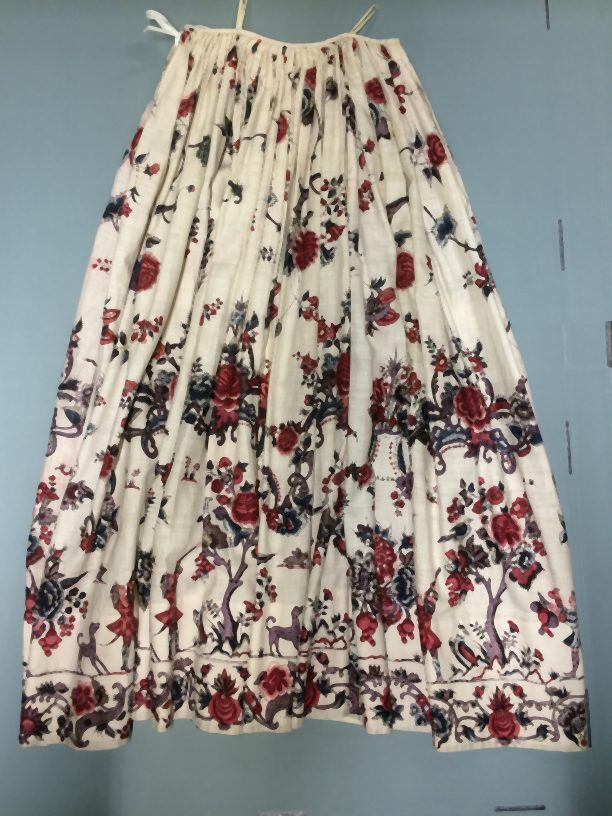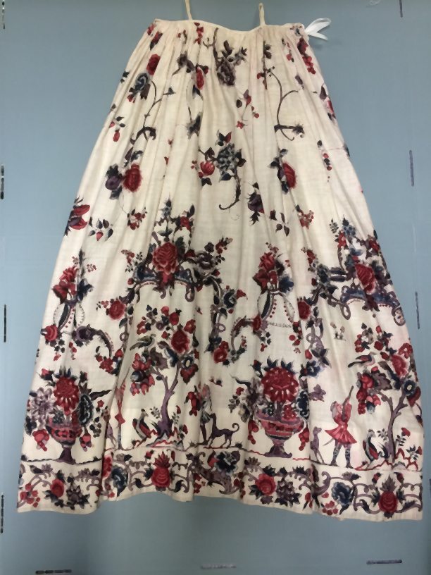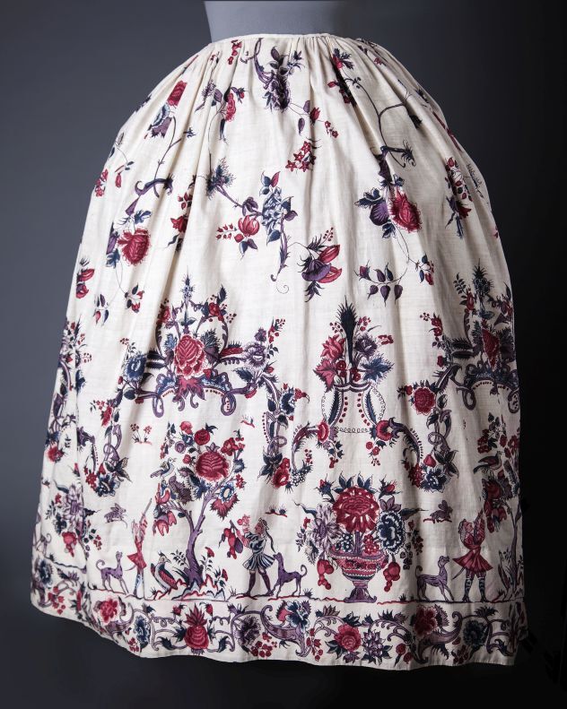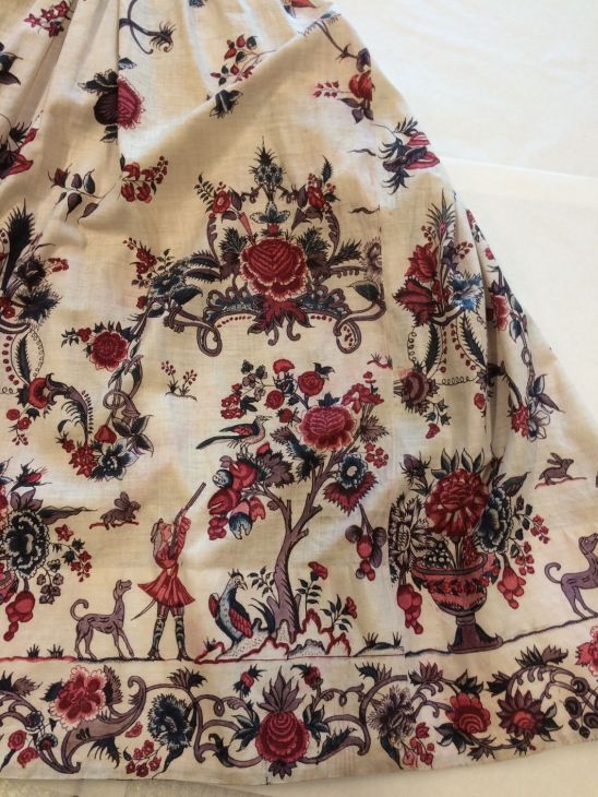 Sitsen vrouwenrok, met rankende toefjes bloemen en randmotief met bloeiende bomen, bloemvazen, jagers, druivenplukkers, honden, konijnen en vogels.