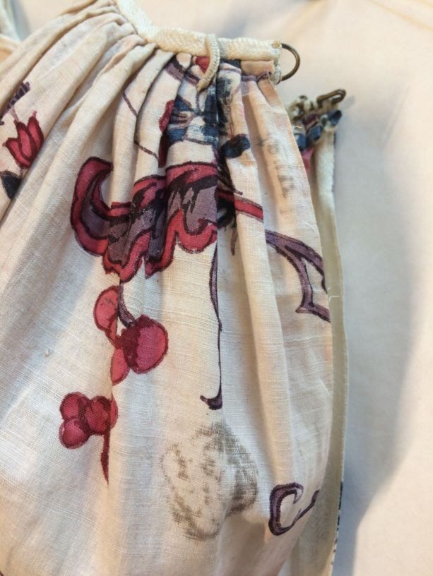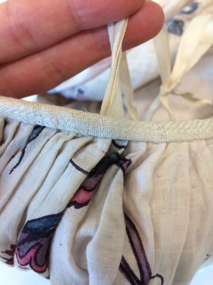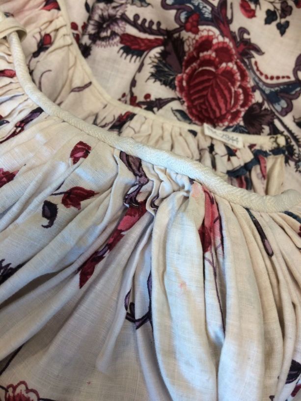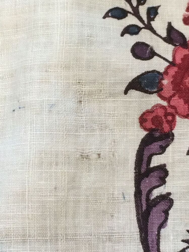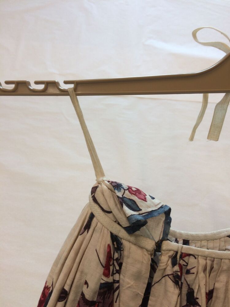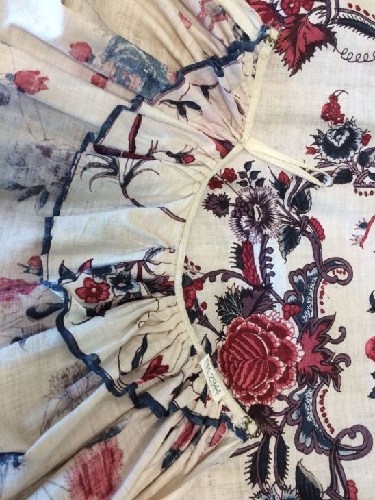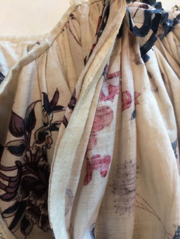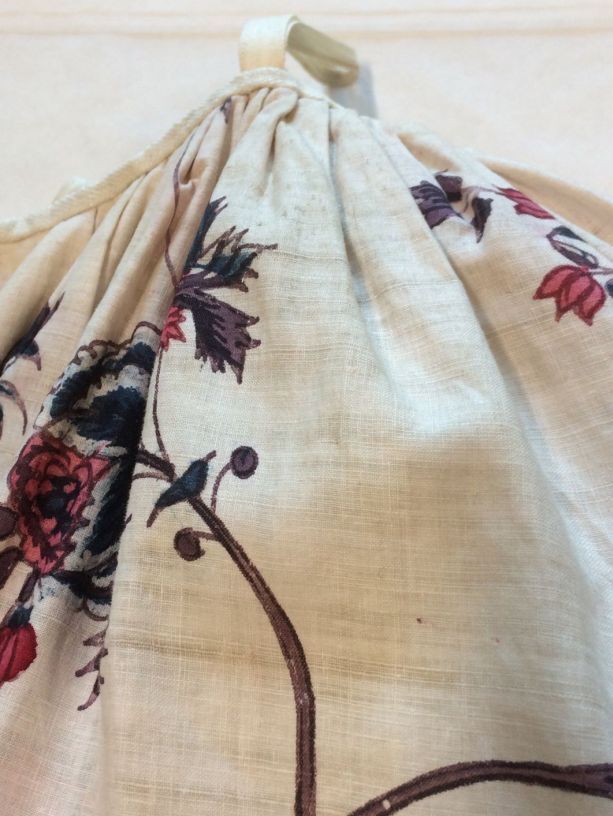 Sitsen vrouwenrok, met rankende toefjes bloemen en randmotief met bloeiende bomen, bloemvazen, jagers, druivenplukkers, honden, konijnen en vogels.