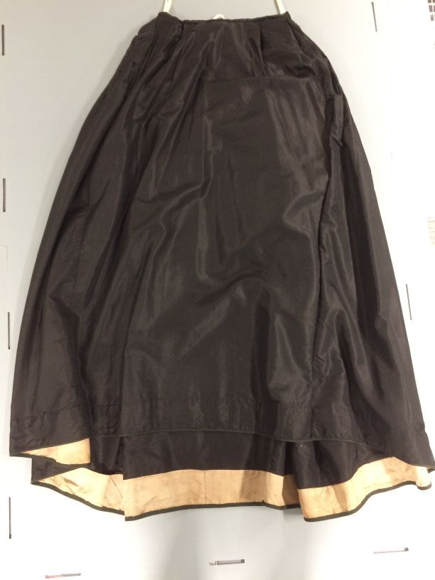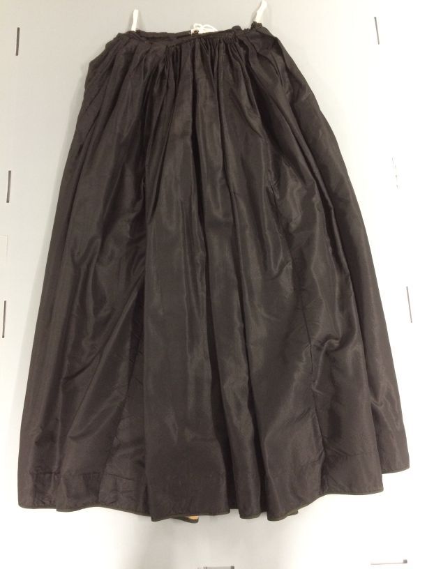 Rok, onderdeel van kostuum van zwarte verzwaarde zijde met aangeknipt schootje, afgezet met fluweelband en kant