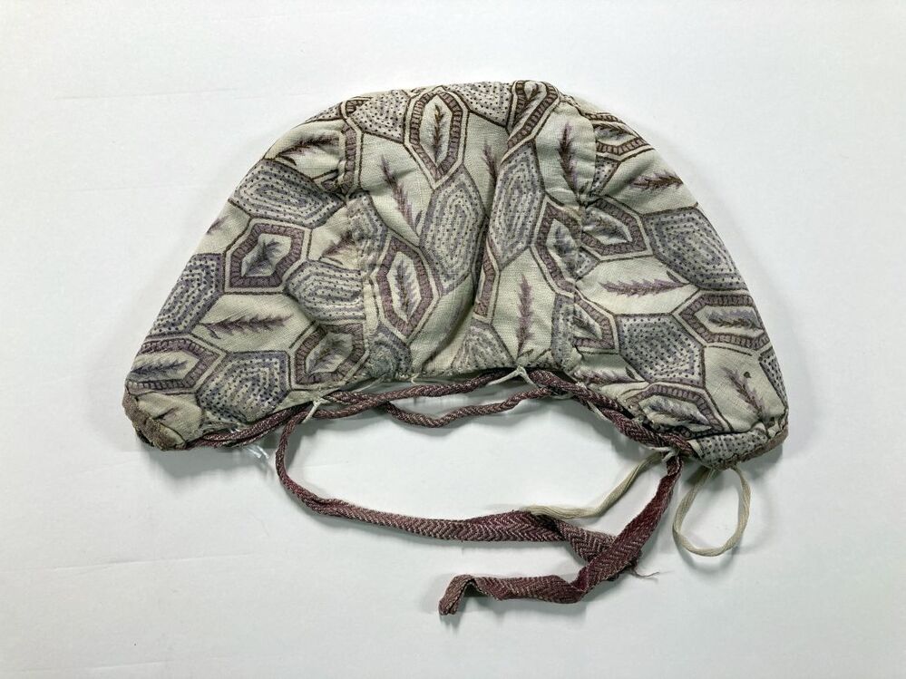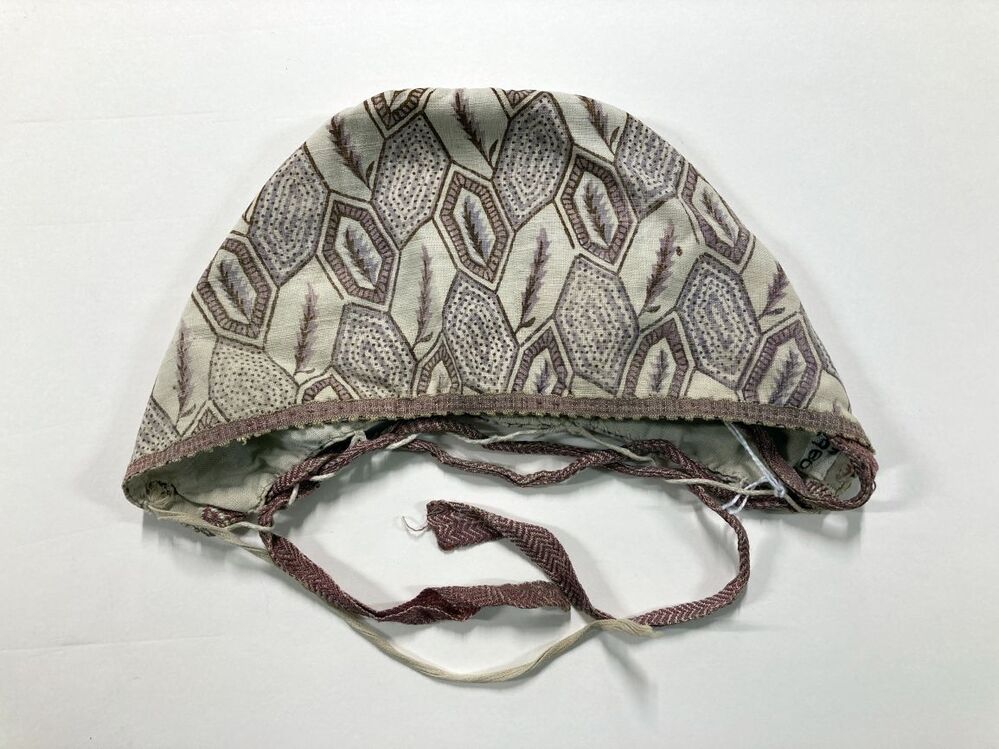 Muts van bedrukt katoen, wit fond met paarse zeshoekige figuren, waarin takjes
