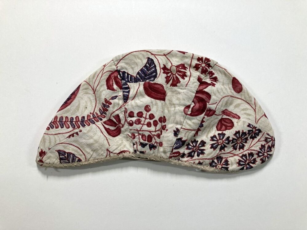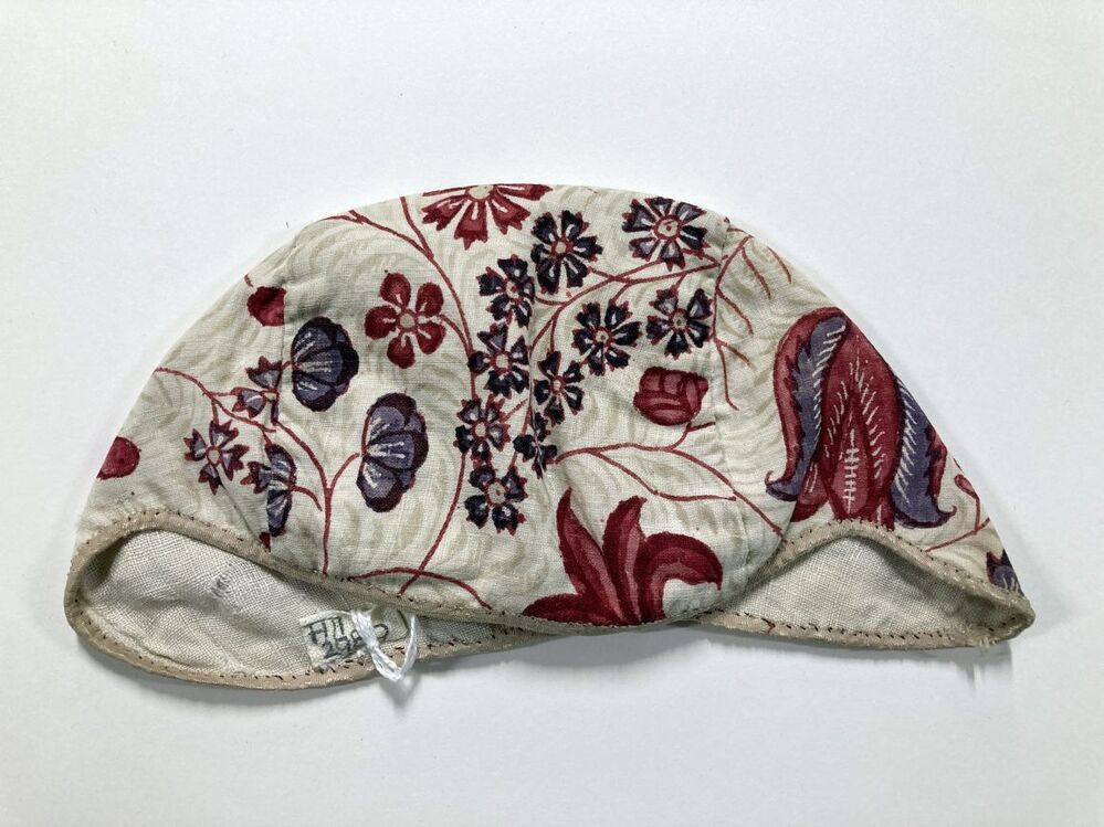 Sitsen meisjesmuts, met rode stengels met gestileerde bloemen op witte grond