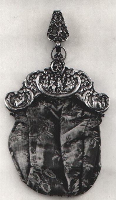 Zilveren tasbeugel en haak met figurale voorstellingen en bloemranken, aan tas van rood-wit brokaat