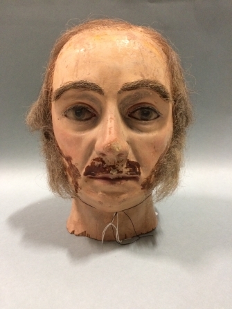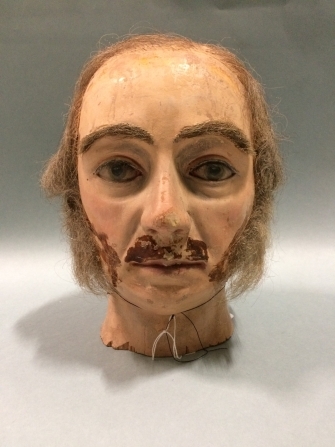 Mannenpop met houten hoofd met grijs haar voor Hindelooper Kamer, alleen hoofd is bewaard gebleven, onderdeel van totaal aankleding Hindelooper man