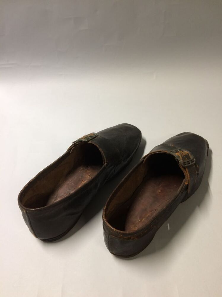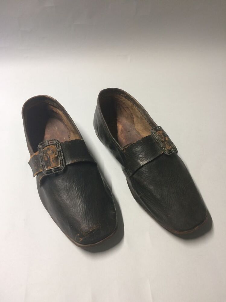 Rechter bruinzwarte leren schoenen met bandje over wreef met zilveren gesp (FB), onderdeel van aankleding Hindelooper man
