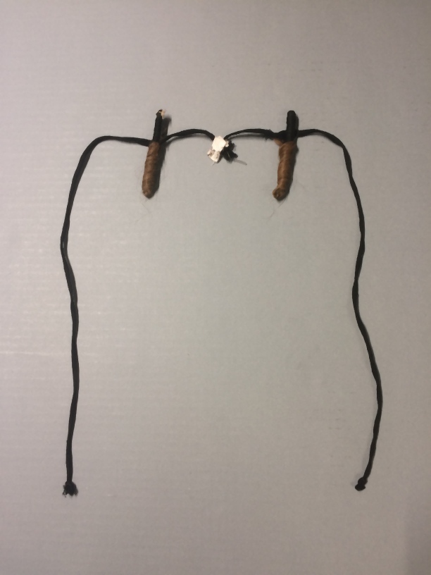 Twee blonde haarrolletjes aan zwart veterband, onderdeel van aankleding Hindelooper vrouw