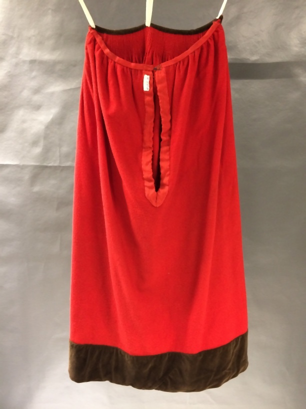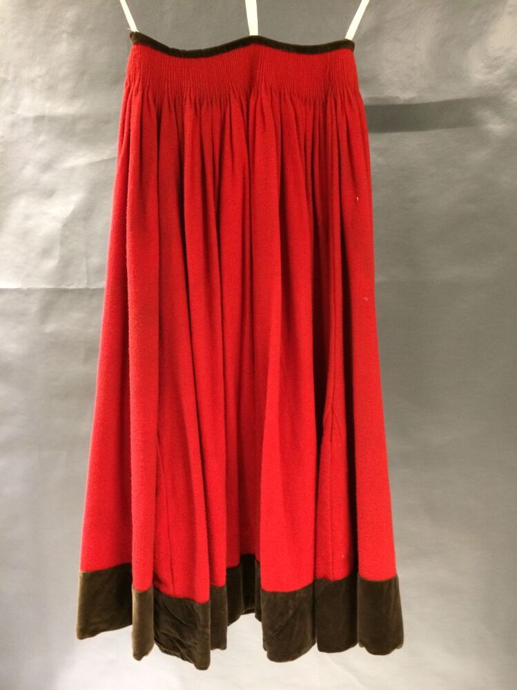 Hindelooper raewolhimd, rood wollen onderrok afgezet met bruin fluwelen zoom, split afgezet met rood band, onderdeel van aankleding ongetrouwd Hindelooper meisje