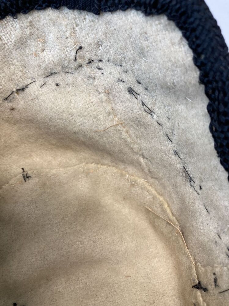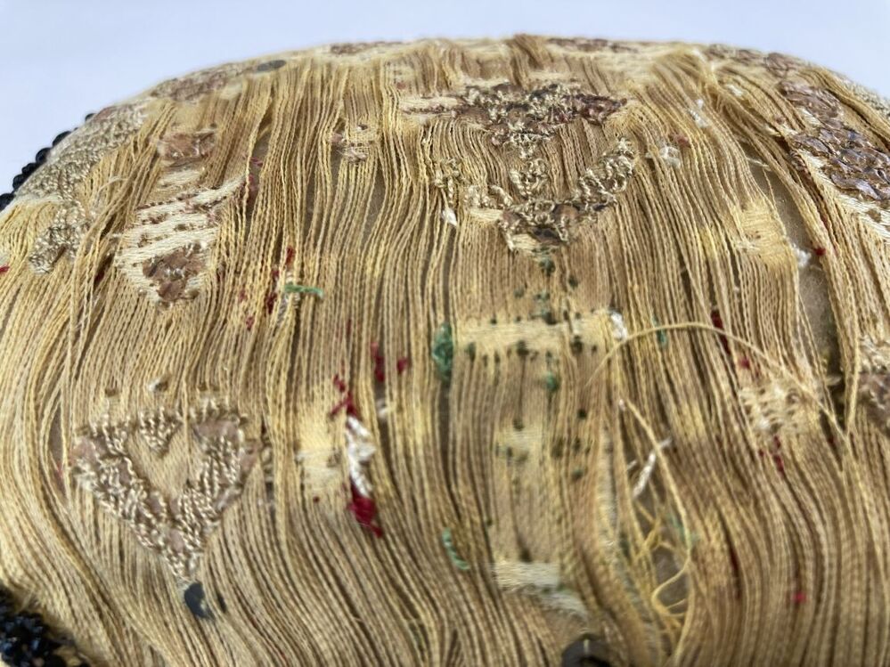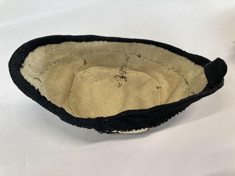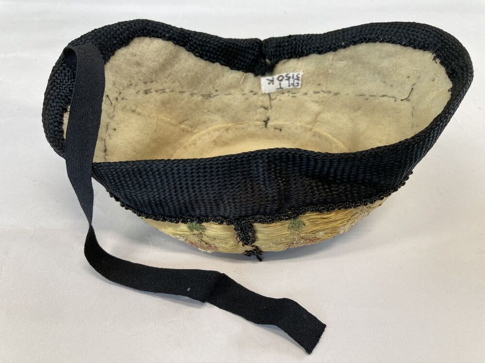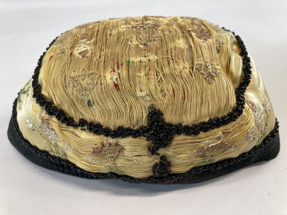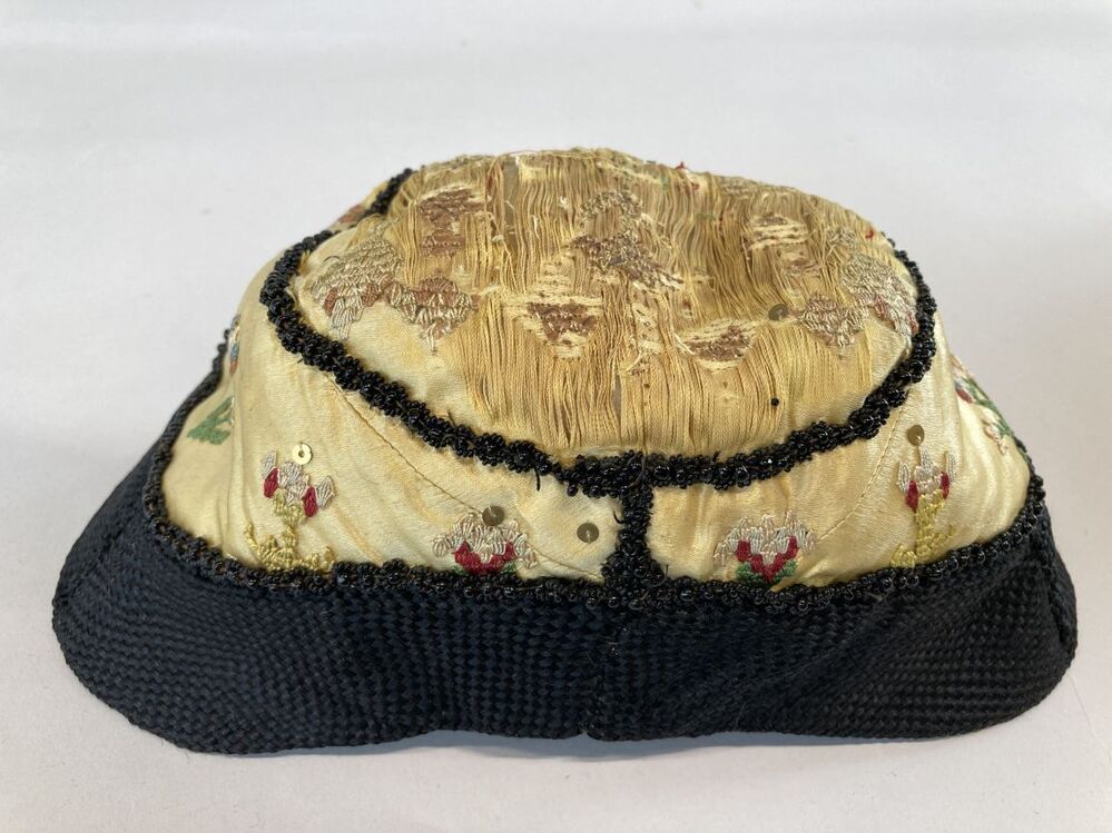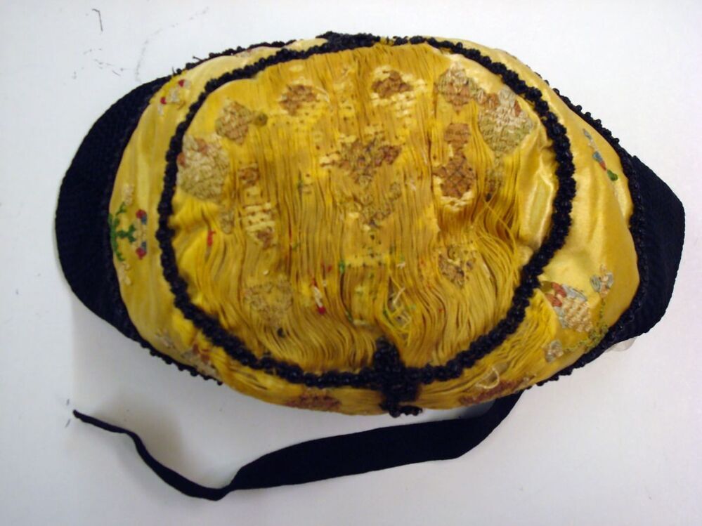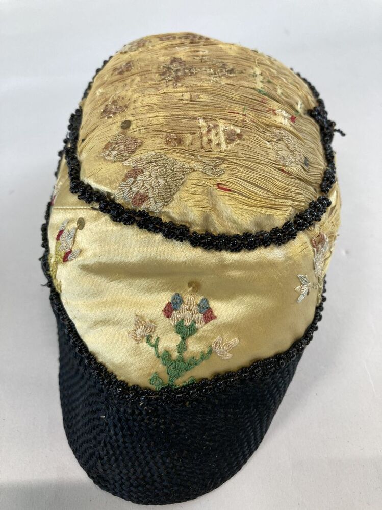 Hindelooper klappe, peutermuts, van gele zijde omboord met zwart kunstzijden band en zwarte kralen, geborduurd in rococosteek met lovertjes