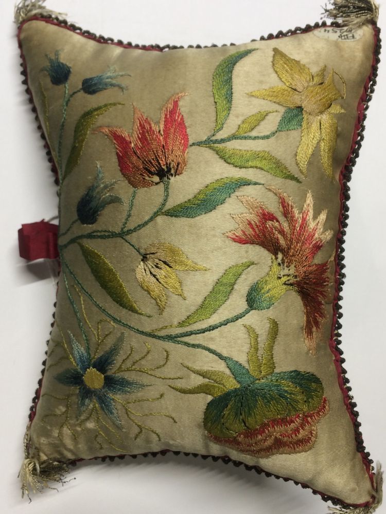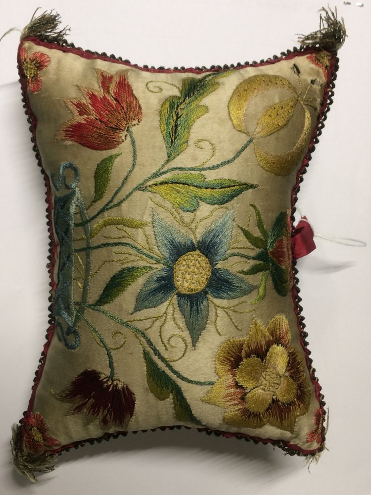 Bakerspeldenkussen van satijn waarop bloemenornament, in de kleuren rood, blauw, groen en beige