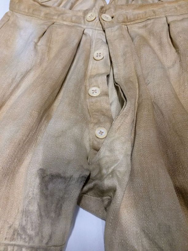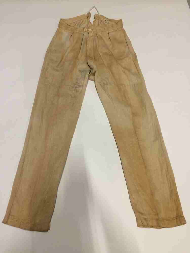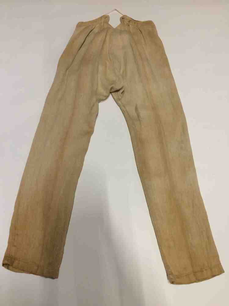 Witte lange (werk)broek van grof linnen, met gulpsluiting