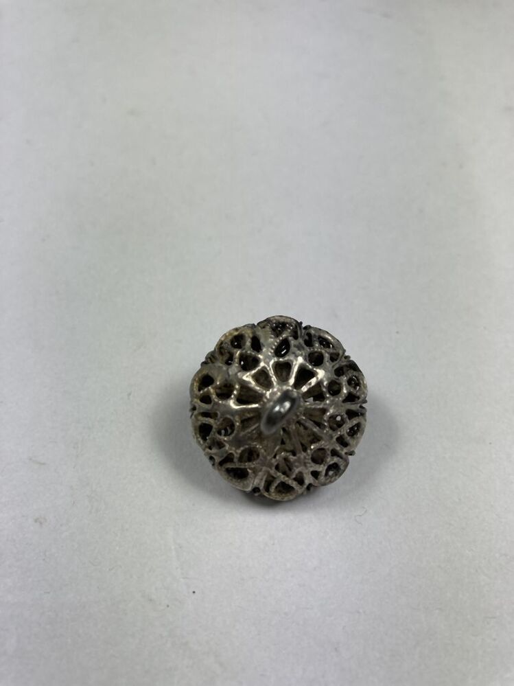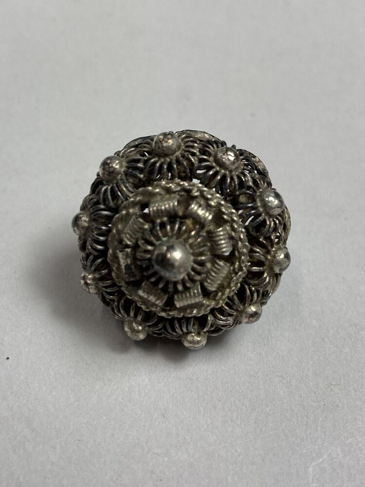 Knoop met bolle onderkant en kegelvormige bovenkant, op de bovenkant een krans van tien bolletjes, eromheen een spiraalband, onderdeel van groep van zes verschillende ronde filigrainknopen, zogenaamde Zeeuwse knopen