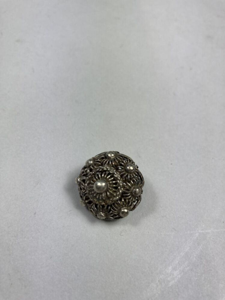 Knoop met bolle onderkant en kegelvormige bovenkant, op de bovenkant een krans van tien bolletjes, eromheen een spiraalband, onderdeel van groep van zes verschillende ronde filigrainknopen, zogenaamde Zeeuwse knopen