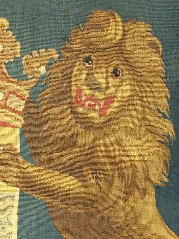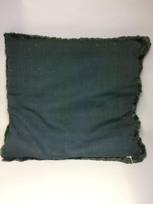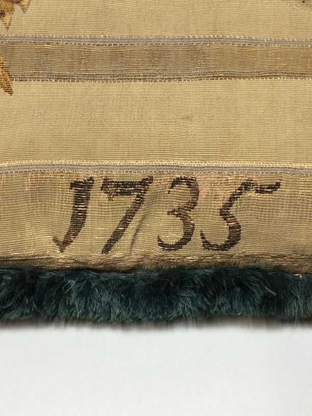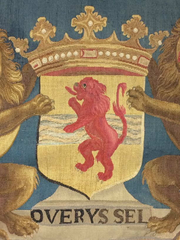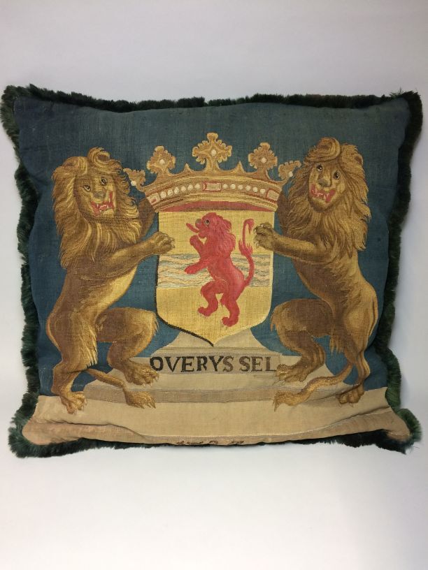 Wollen gobelin kussen met ingeweven wapen van Overijssel gehouden door twee leeuwen, op donkerblauwe grond en beige basis, gedateerd 1735, rondom blauwgroen mohair franje