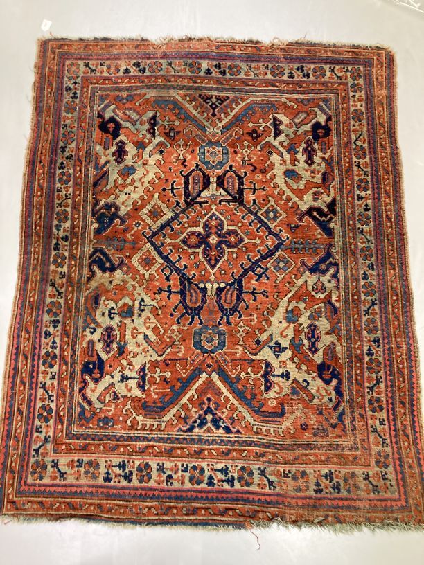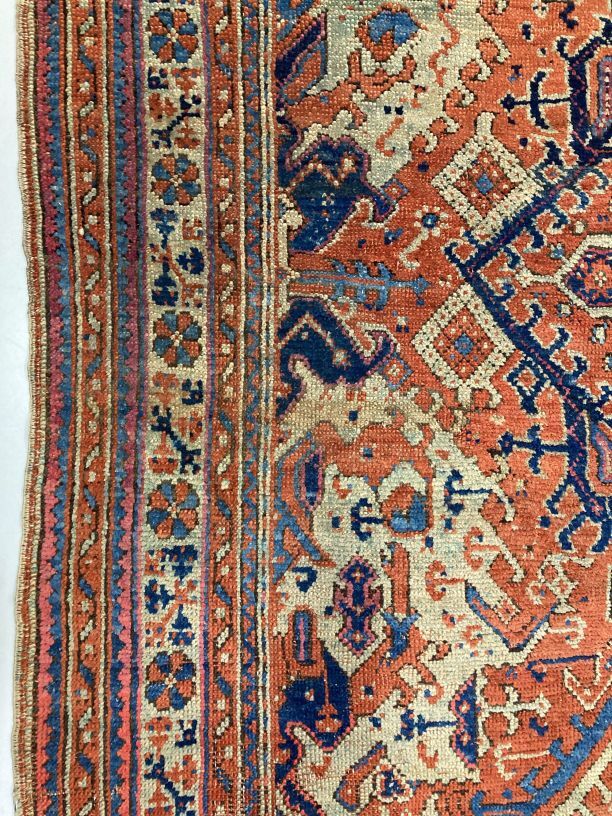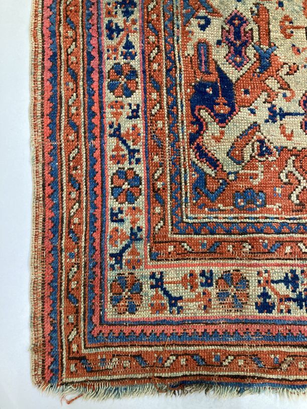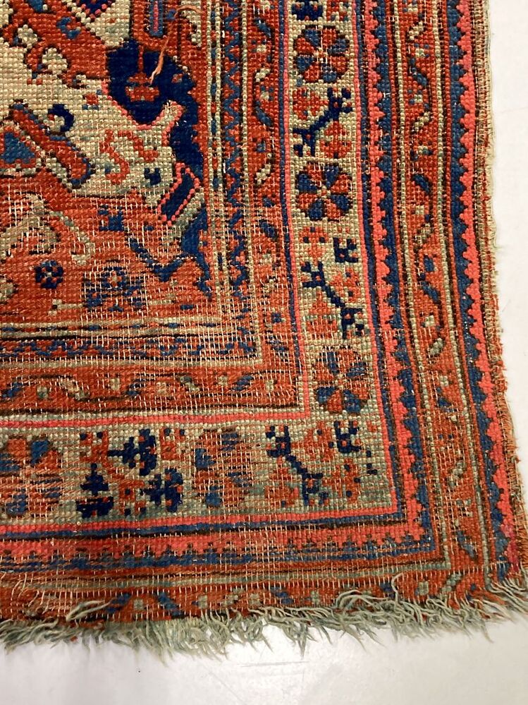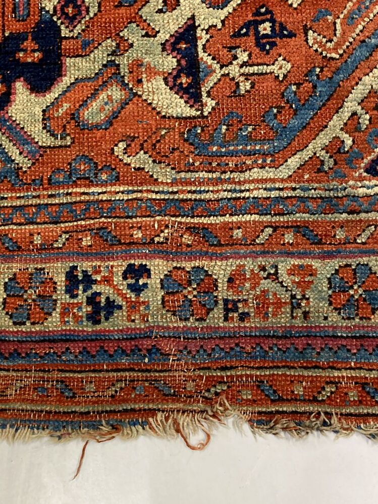Smyrna tapijt, roodfond en rand van acht banden met bloempatronen in verscheidene kleuren