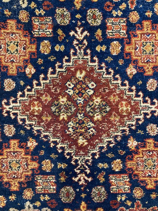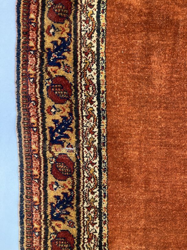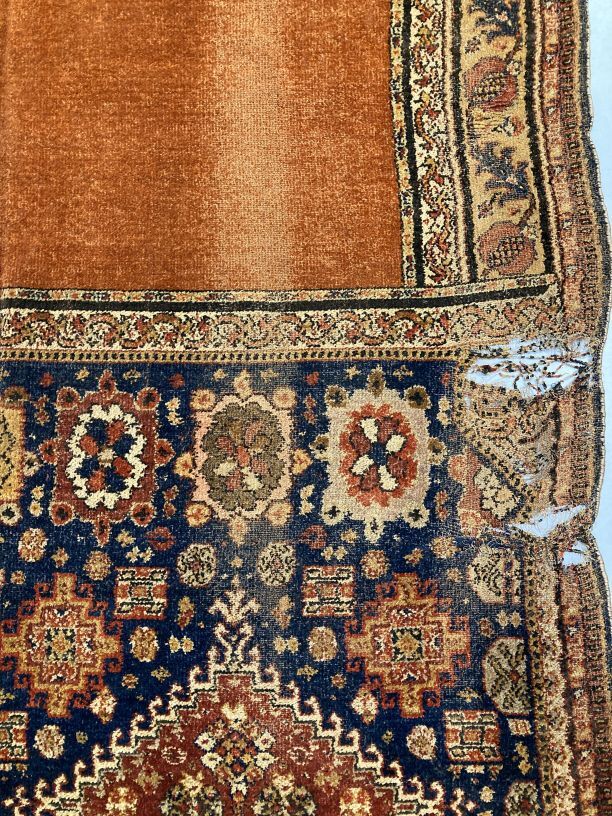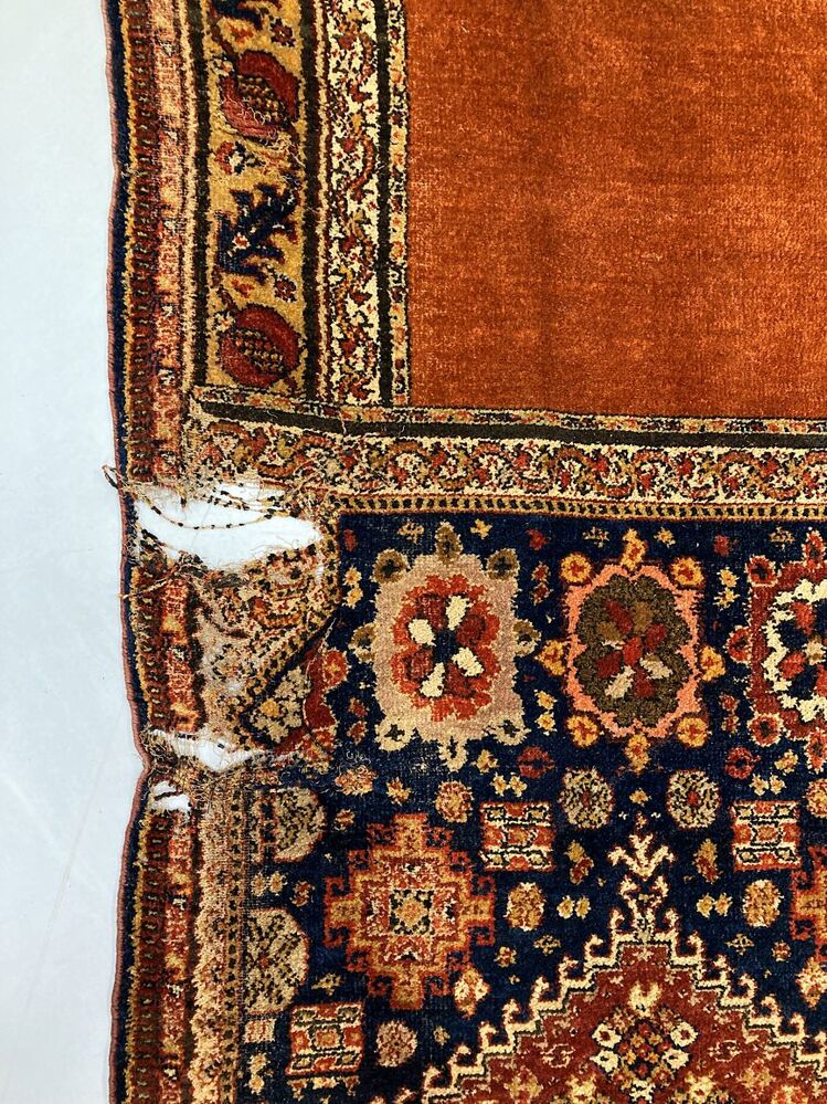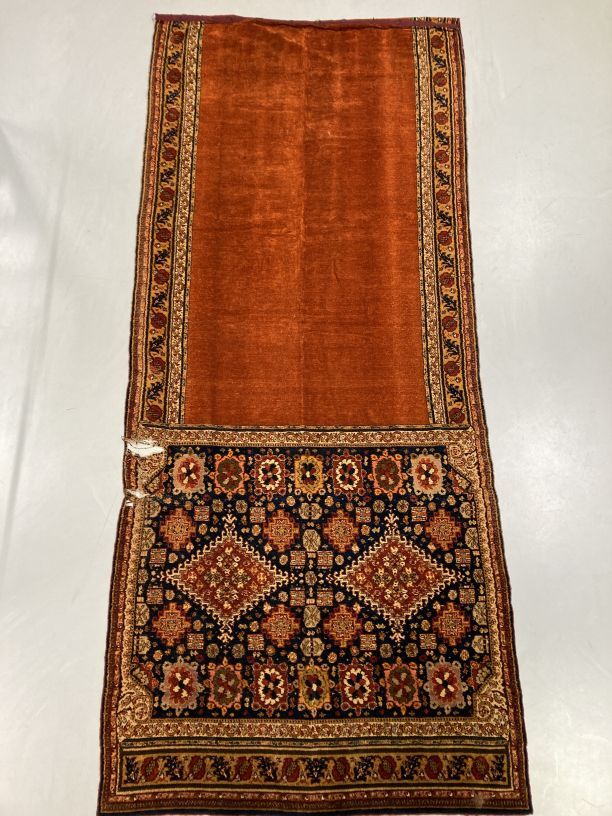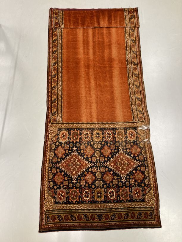 Overgordijn van rode pluche op fluweel, in het pluche zijn verschillend motieven verwerkt, onderdeel van groep van twee