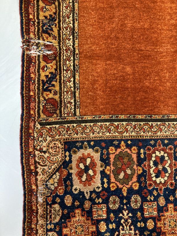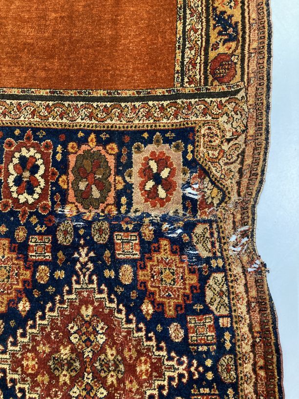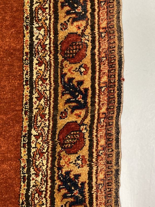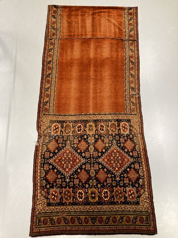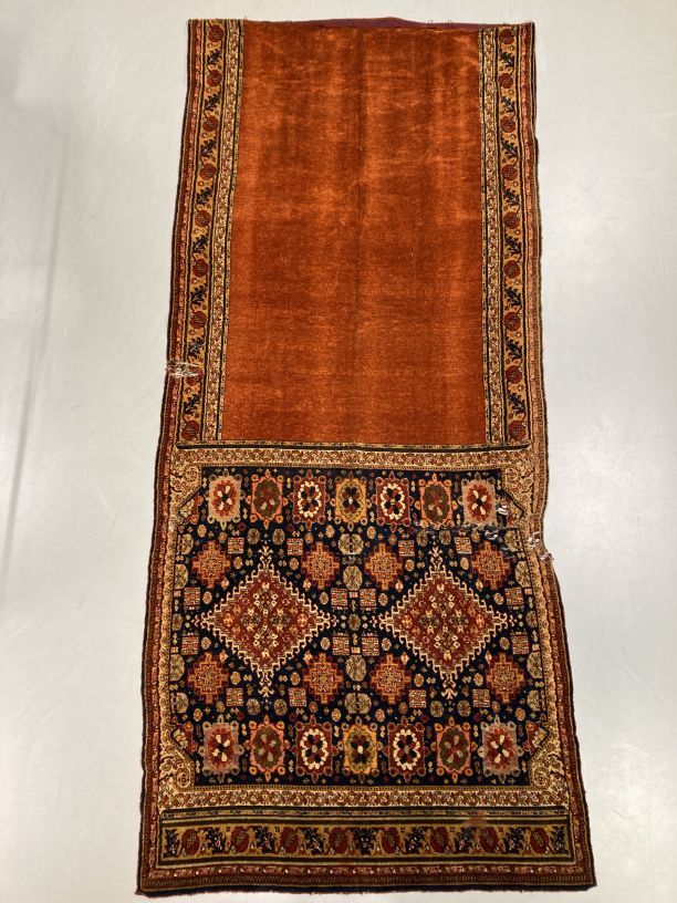 Overgordijn van rode pluche op fluweel, in het pluche zijn verschillend motieven verwerkt, onderdeel van groep van twee