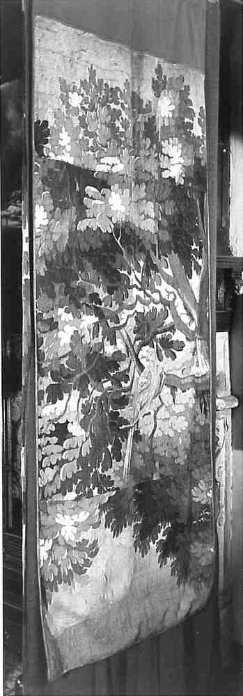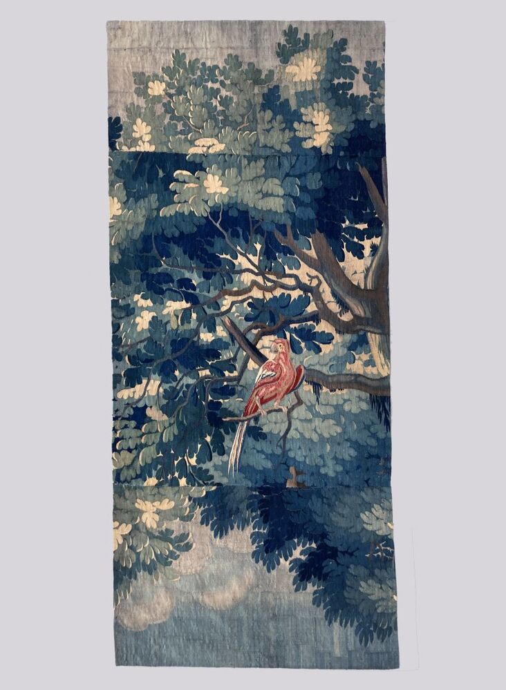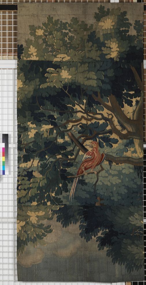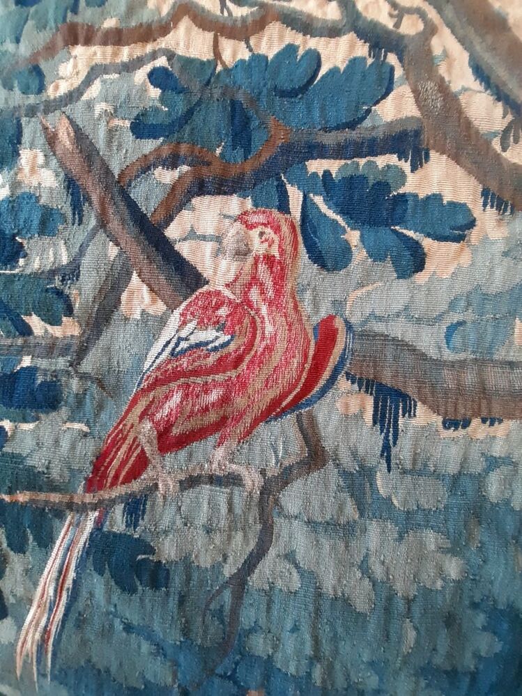 Fragment van groenwerktapijt of landschapsverdure met rode papegaai