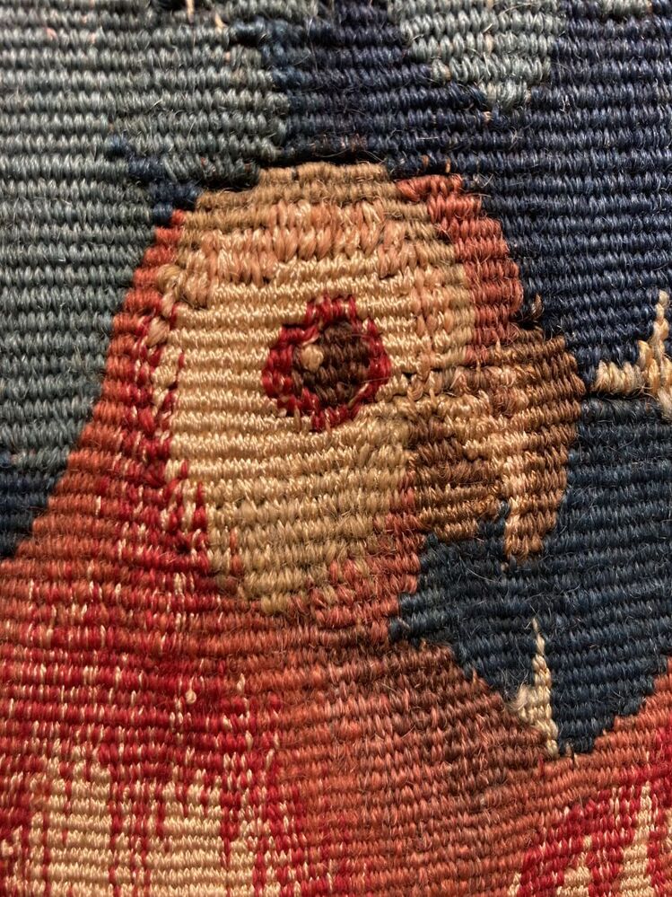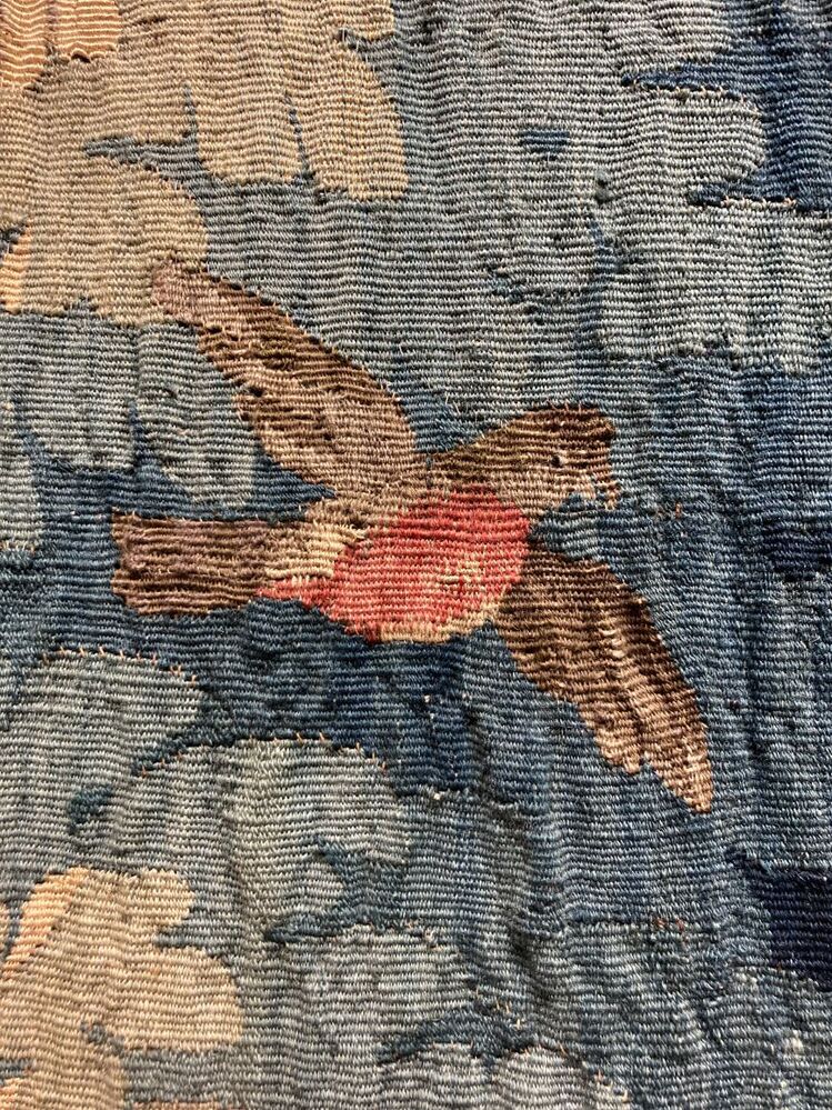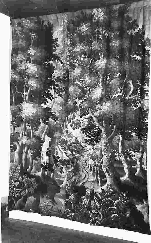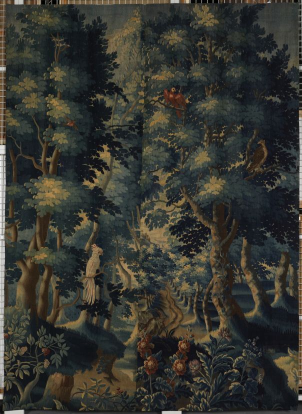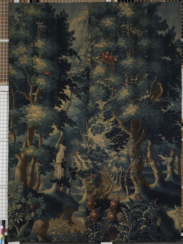Fragment van groenwerktapijt of landschapsverdure met witte kaketoe en bok