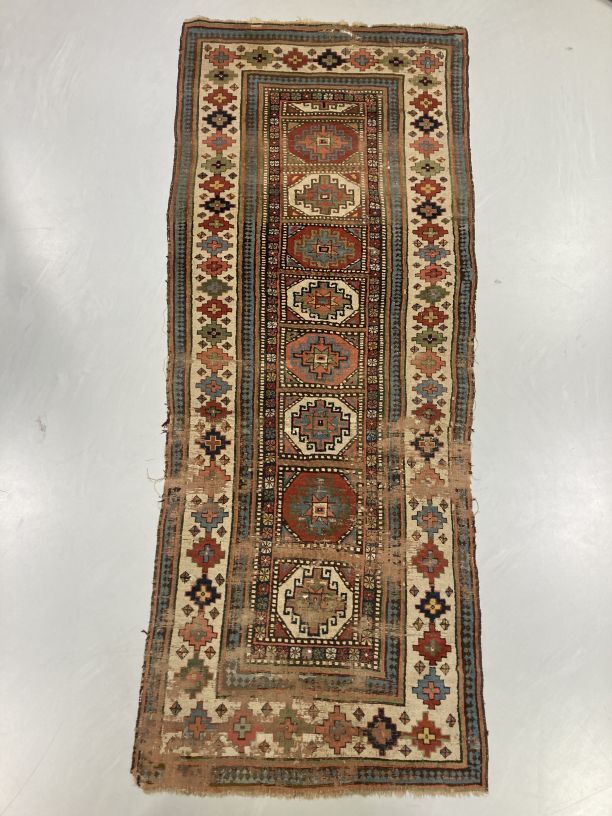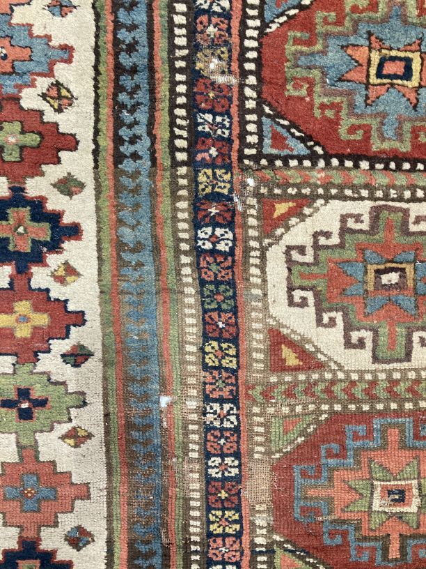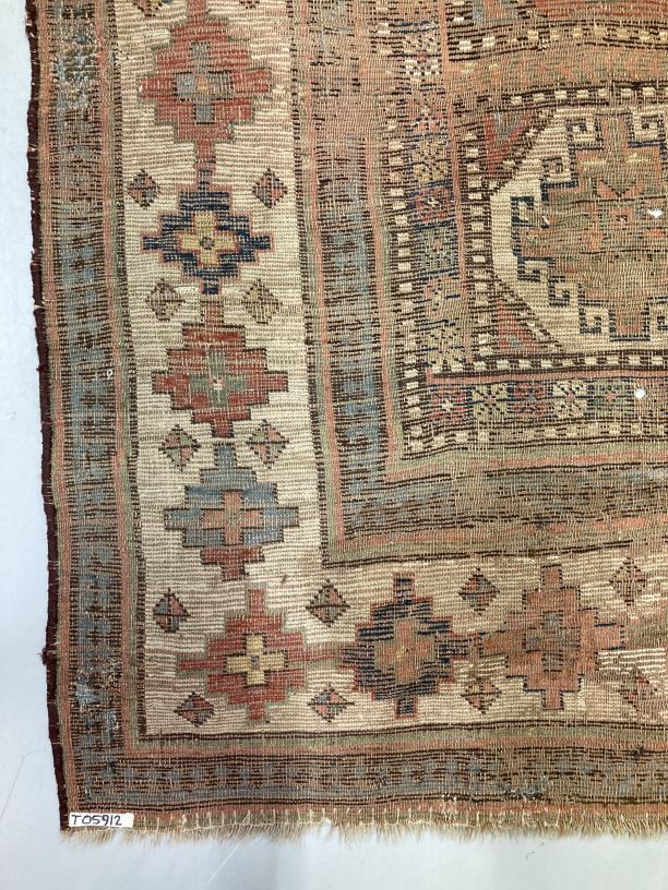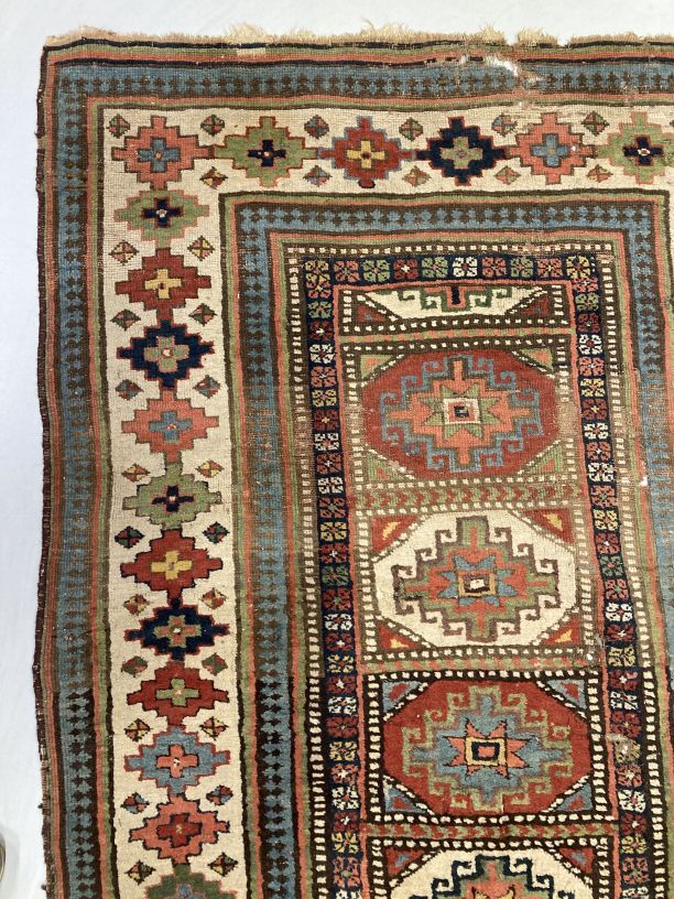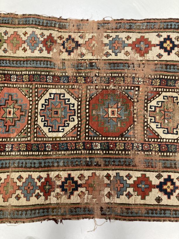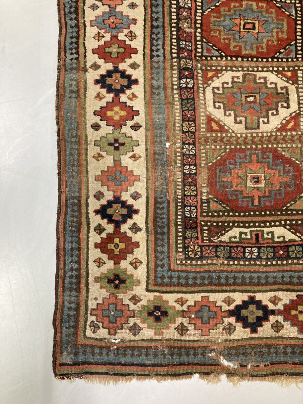 Smyrna kleedje met in het midden acht vierkanten in wit en rood met brede witte rand waarin ruitvormige figuren
