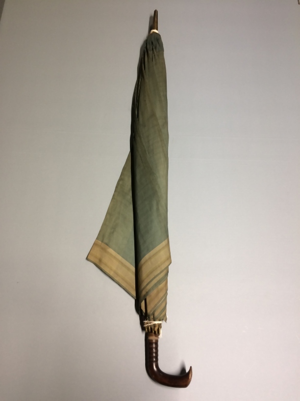 Groen zijden paraplu met lichtgroen gestreepte rand, haakvormig handvat en koperen punt, walvisballeinen