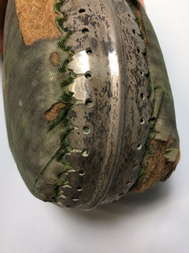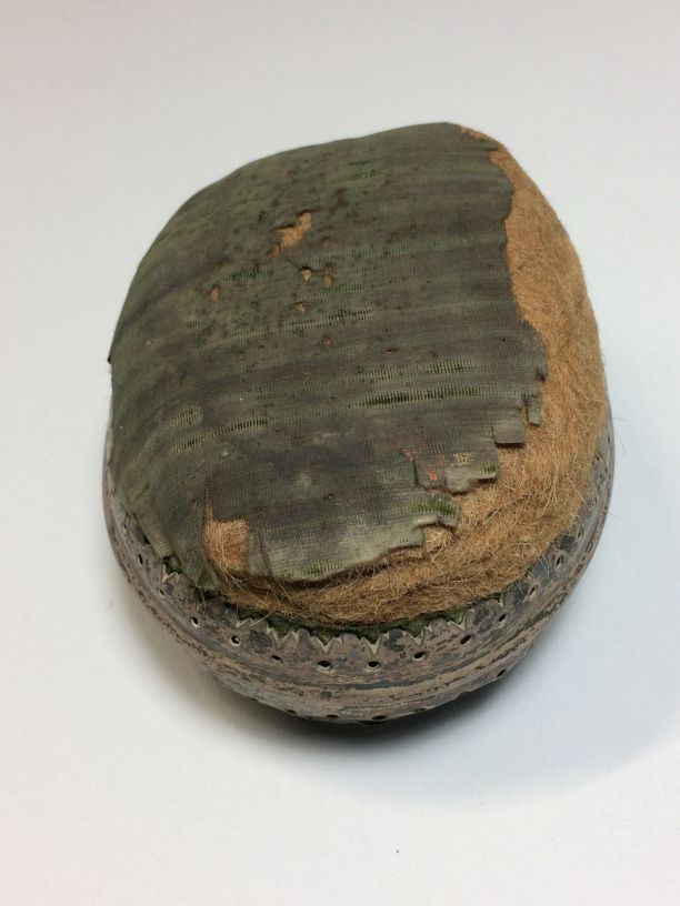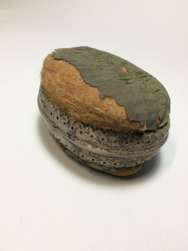 Bakerspeldenkussen, ovaal, van oorspronkelijk groen fluweel in een zilveren montuur