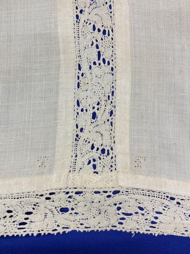 Linnen laken met Vlaams kloskant tussenzetsel en kant, gemerkt TF