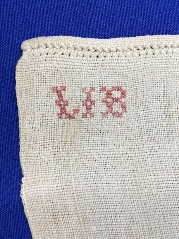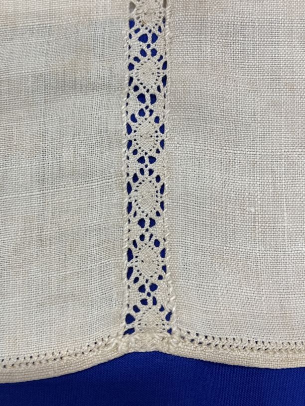 Groot laken met geometrisch kloskant tussenzetsel gemerkt L.I.B.