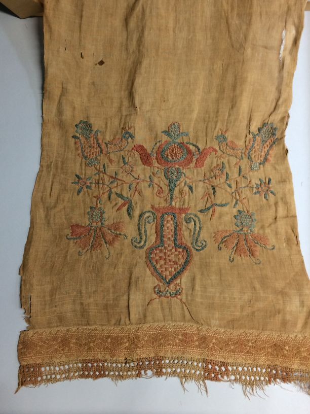 Linnen handdoek met fraai borduurwerk in kleuren voorstellende een bloemvaas met bloemen en takken waarop vogels, aan de andere zijde franje
