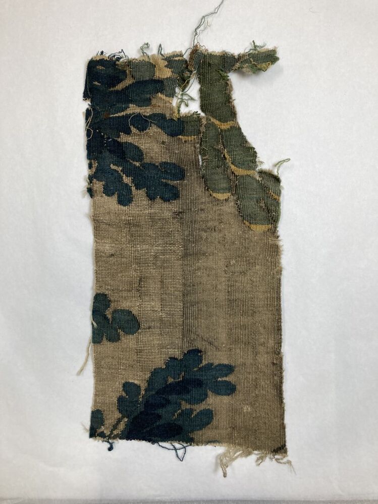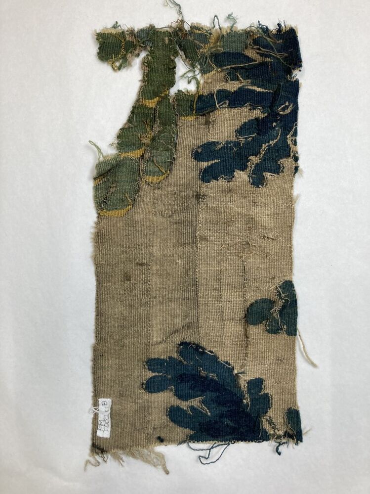 Fragment groenwerktapijt, kleine rechthoekig stuk, onderdeel van 13 kleine fragmenten
