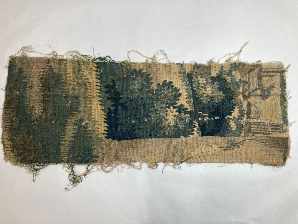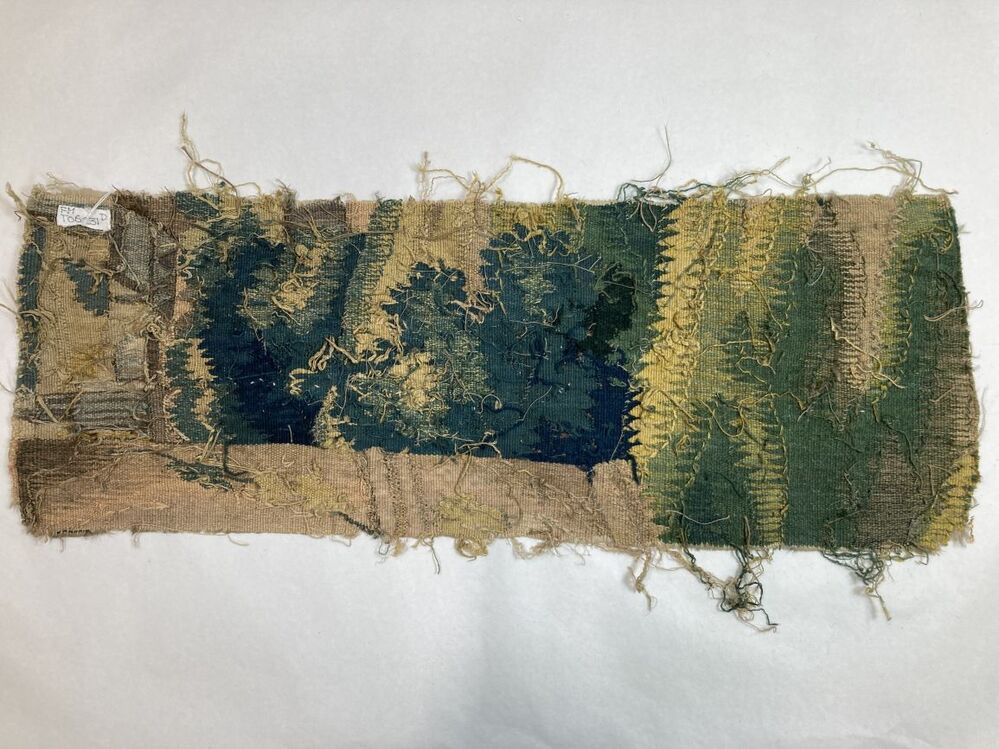 Fragment groenwerktapijt, kleine rechthoekig stuk, onderdeel van 13 kleine fragmenten