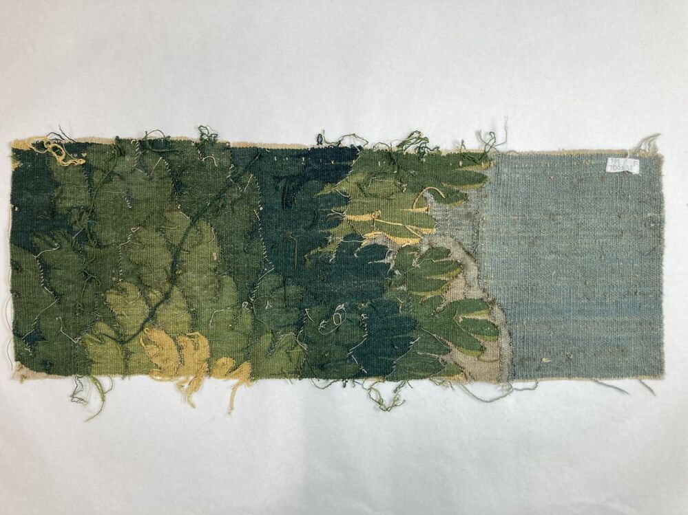 Fragment groenwerktapijt, kleine rechthoekig stuk, onderdeel van 13 kleine fragmenten