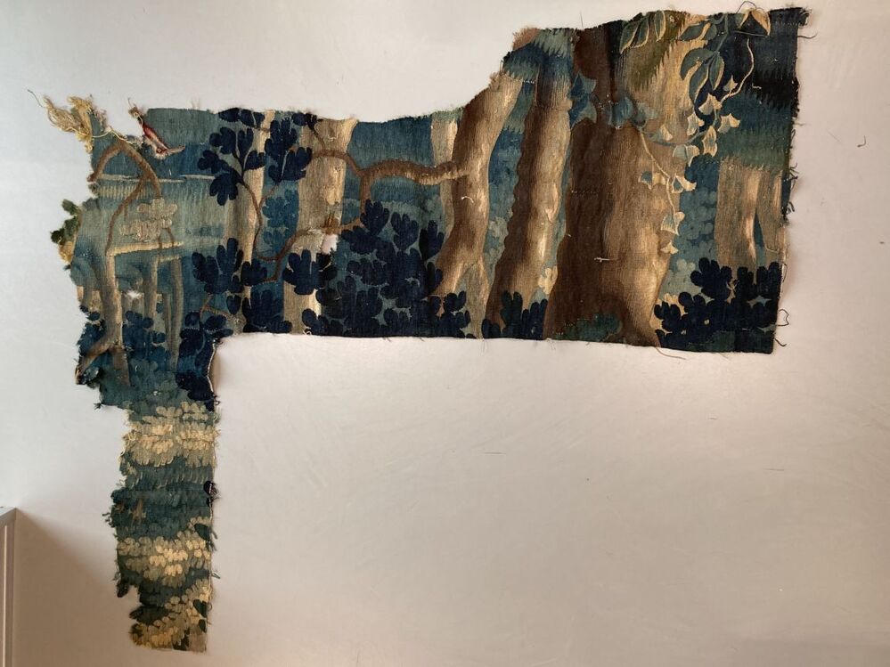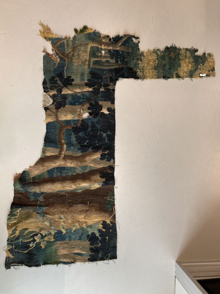Fragment groenwerktapijt, onregelmatig stuk, onderdeel van 13 kleine fragmenten