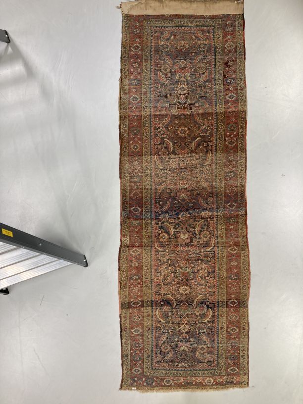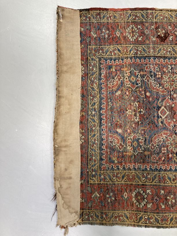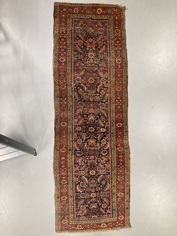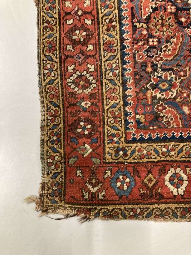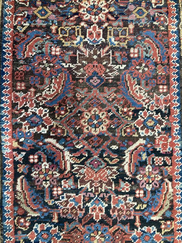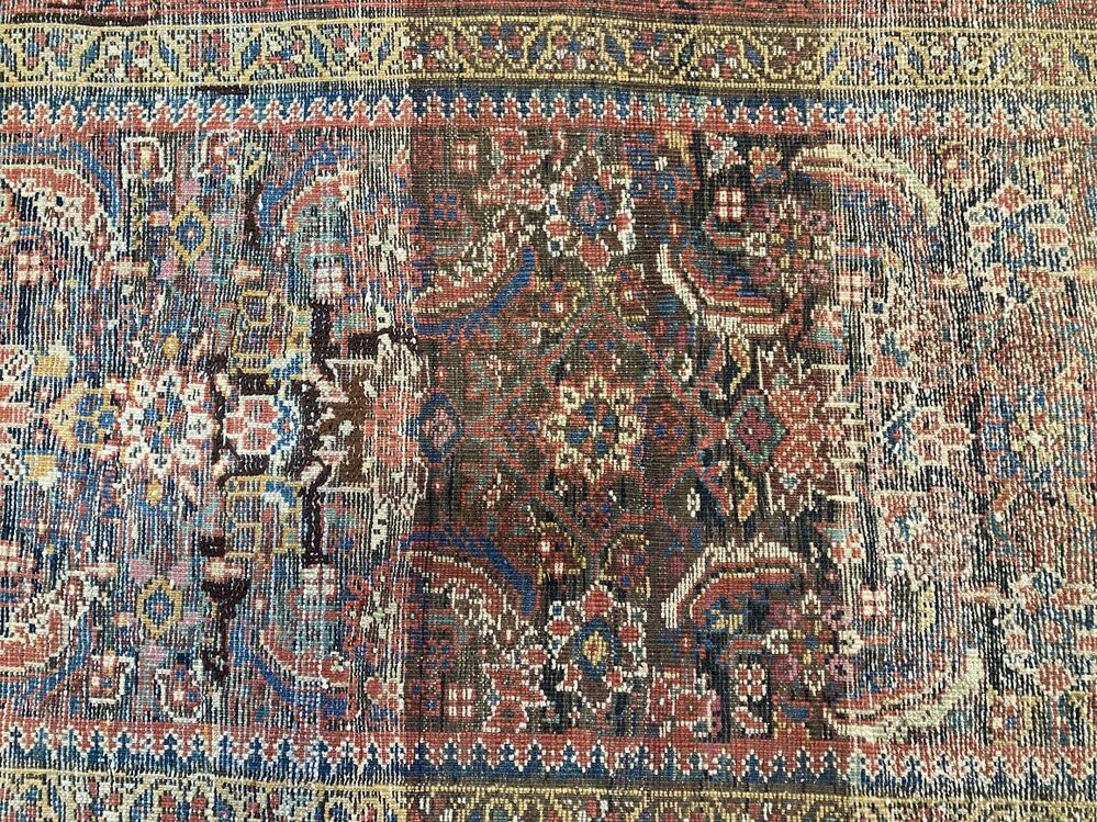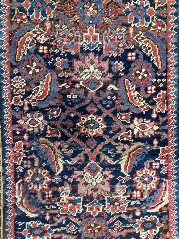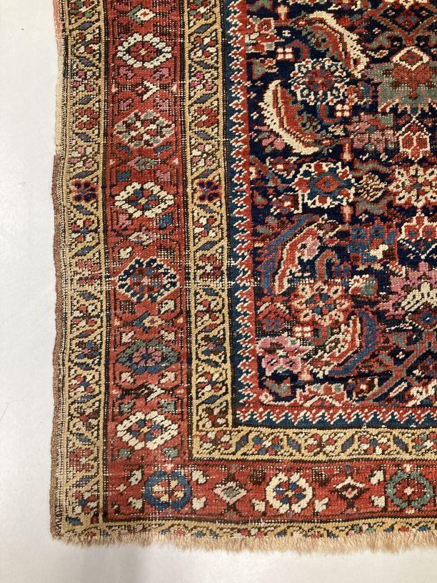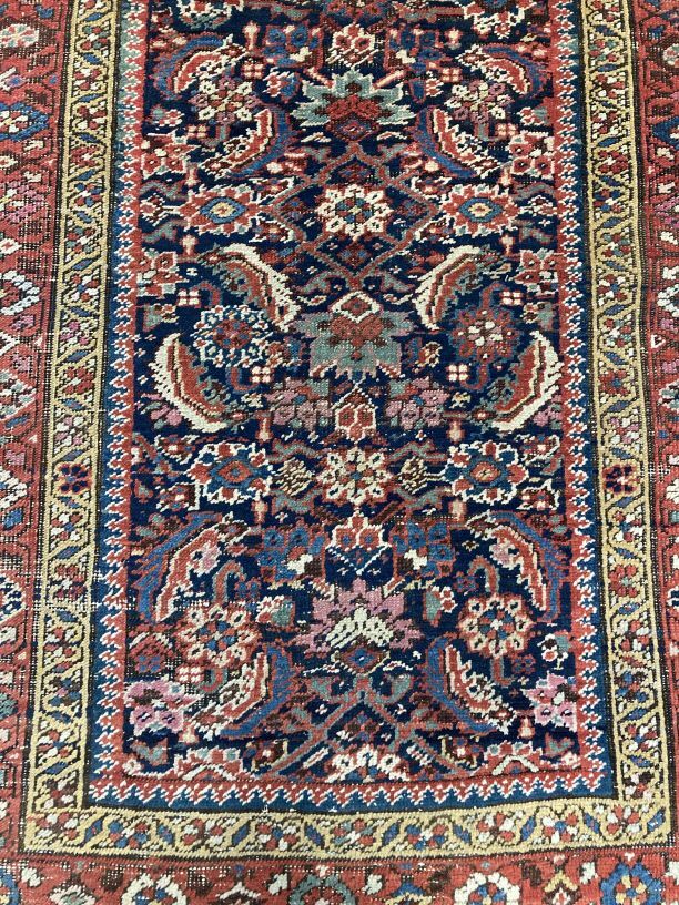 Perzische loper met veelkleurig middenvak waarin blauw als hoofdkleur, daaromheen twee gele randen waartussen een brede rode