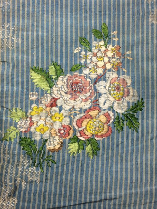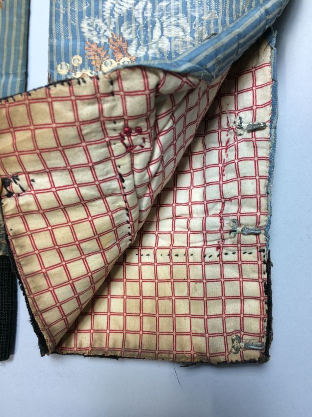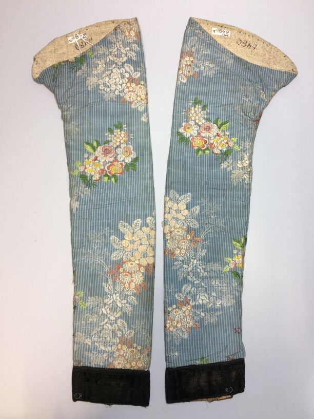 Paar mouwen van blauwe zijde met bloempatroon, gevoerd met wit katoen