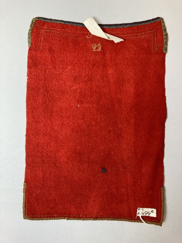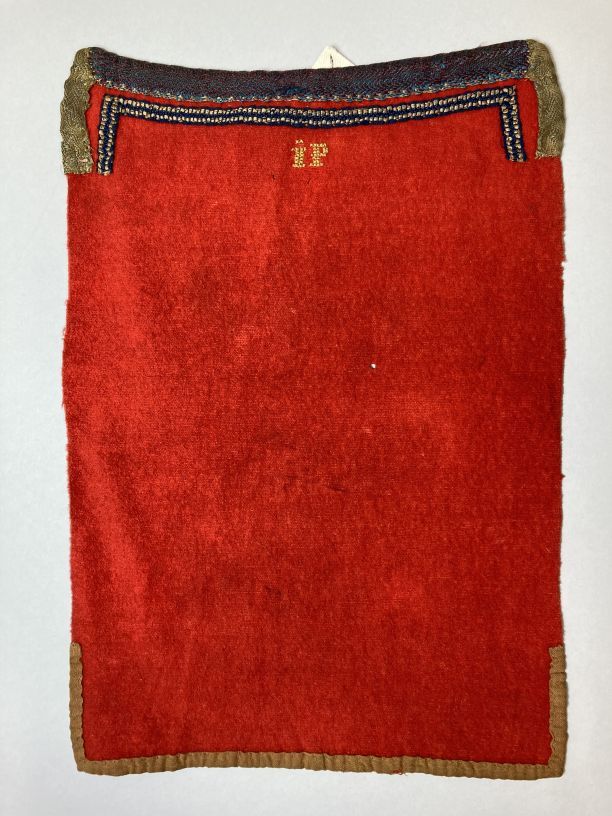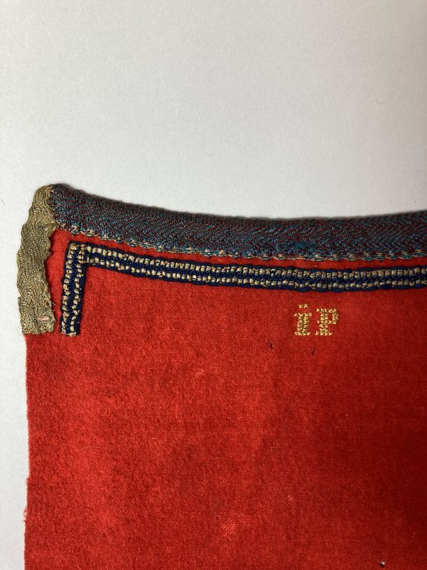 Rood baaien foarpeldook met de initialen I.P. aan de bovenzijde met lintjes afgezet