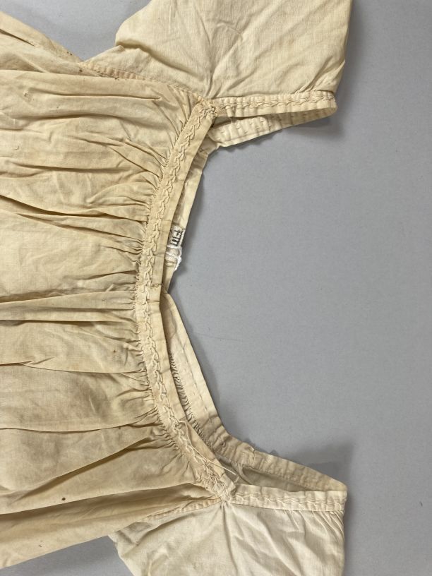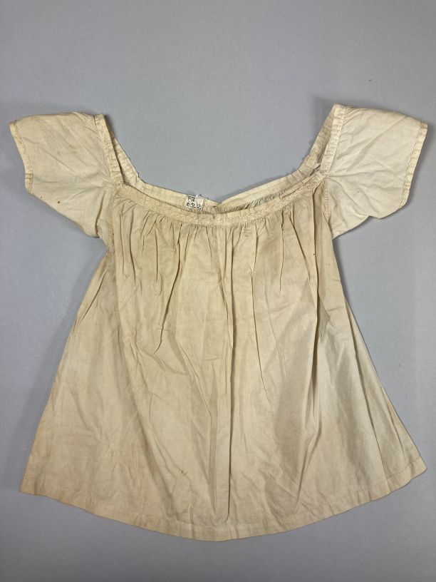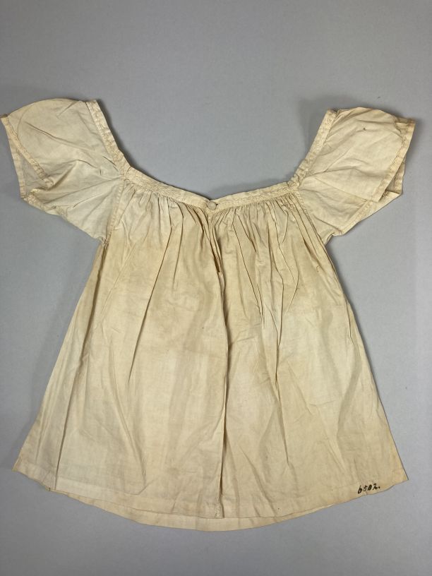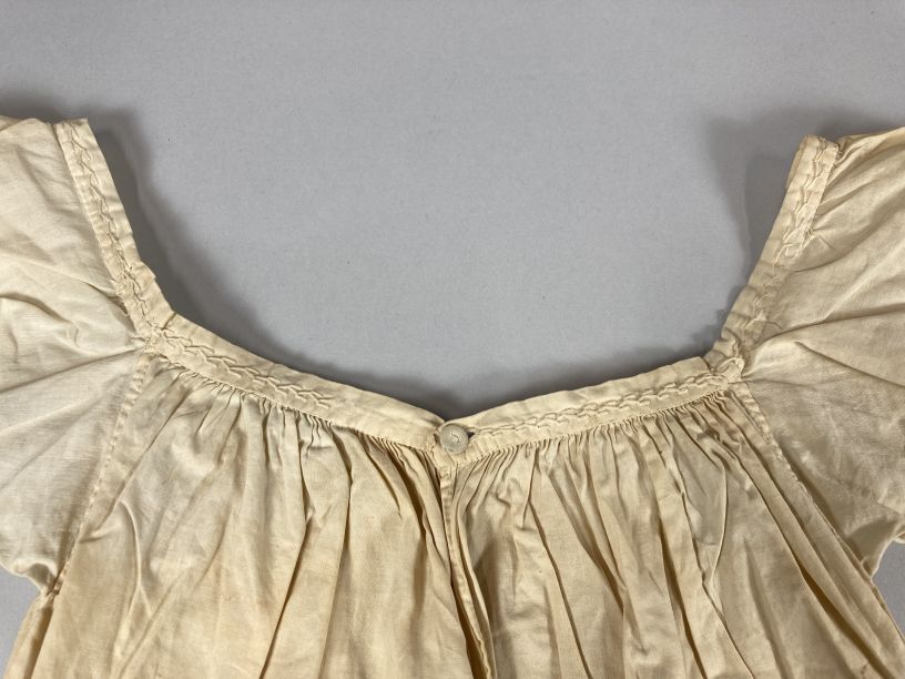 Kinderjurkje met wijde hals van wit katoen gerimpeld aan boordje