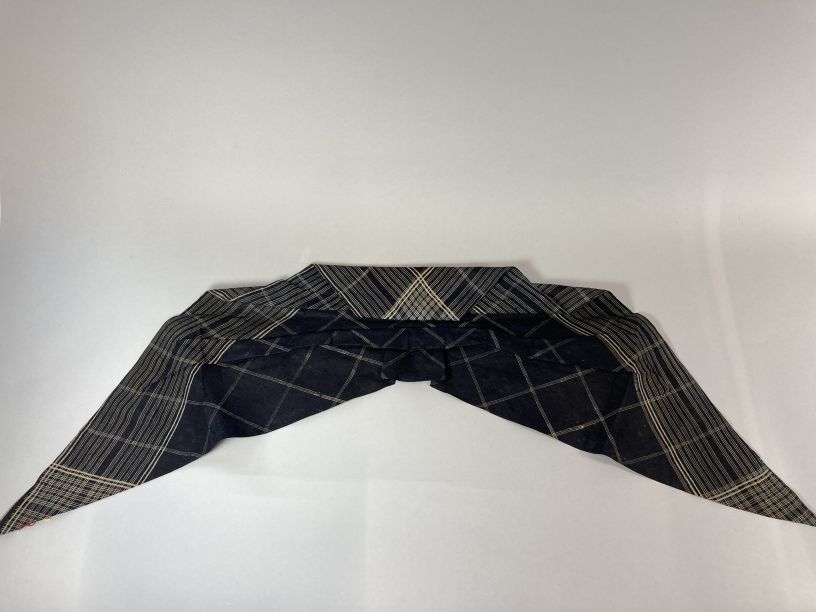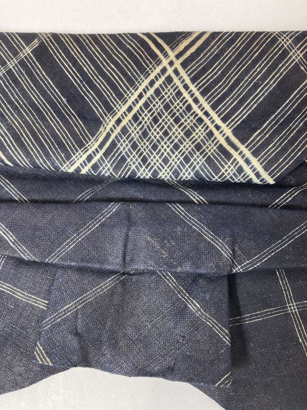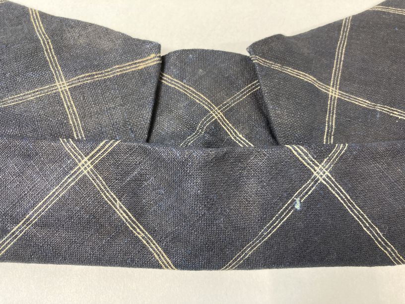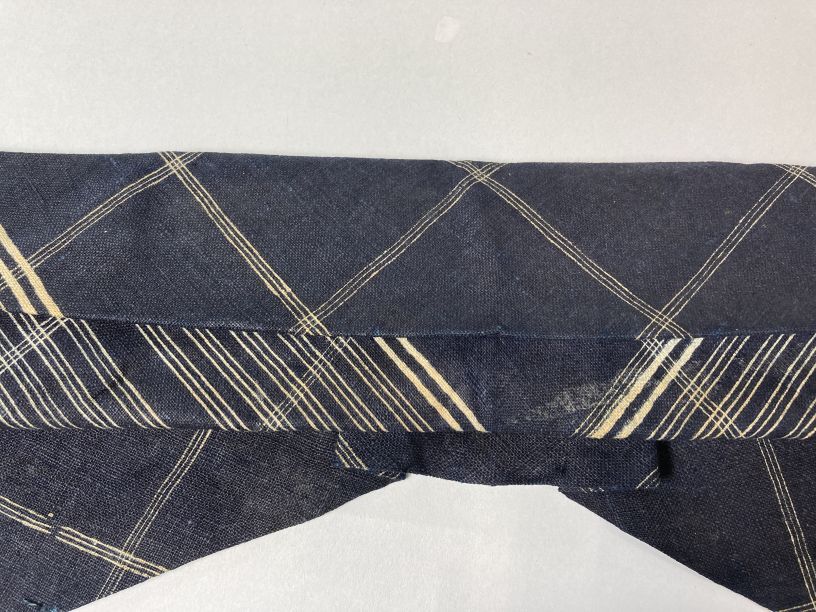 Gevouwen en gesteven zondoek van bedrukt katoen, donkerblauw met witte ruit, onderdeel van groep van vier zondoeken