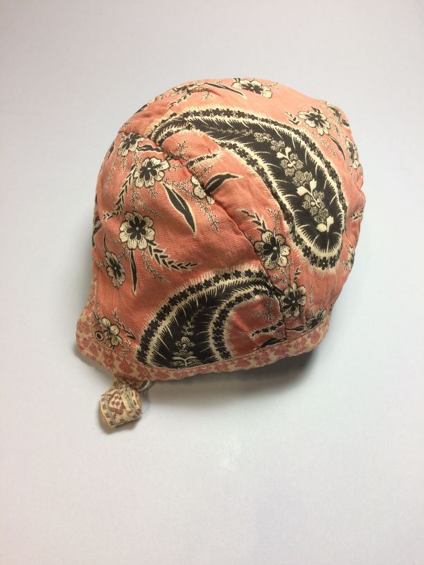 Meisjesmuts van bedrukt katoen, met druppelvormige bloemmotieven op lichtoranje grond