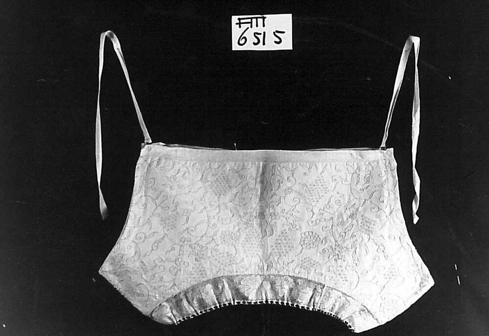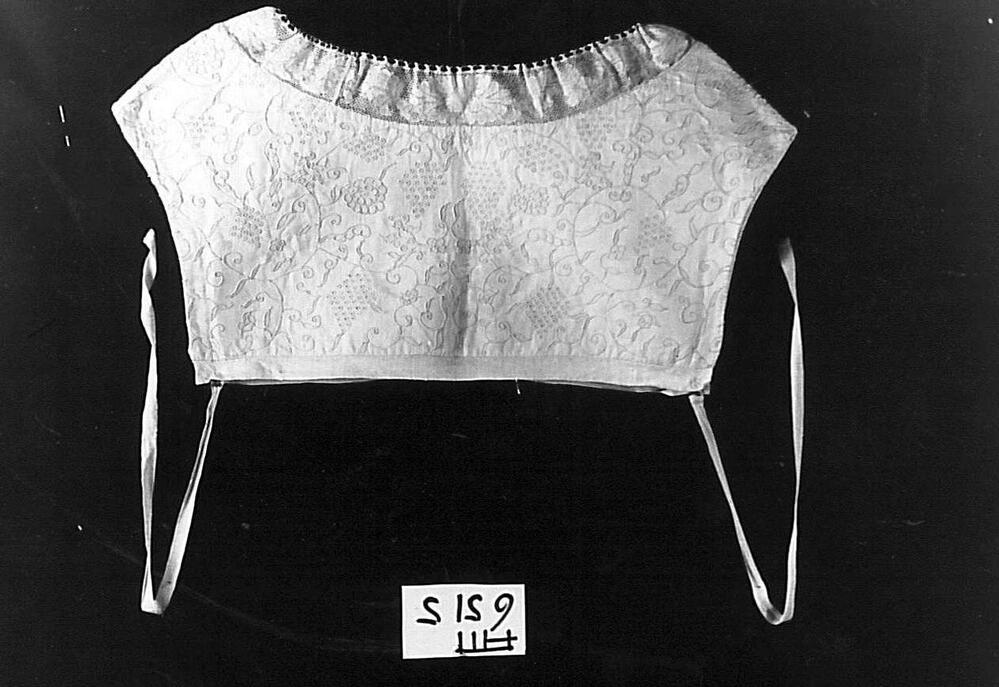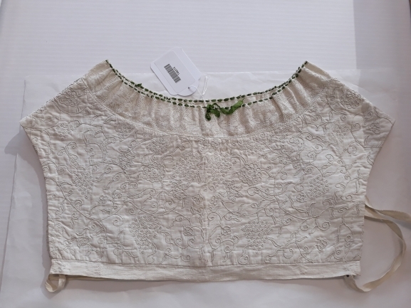 Kroplap van twee soorten wit linnen, wit geborduurd met druiventrossen en afgezet met kloskant