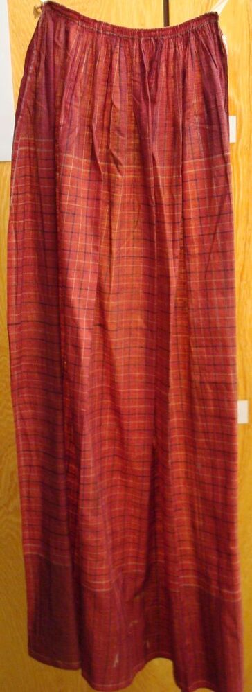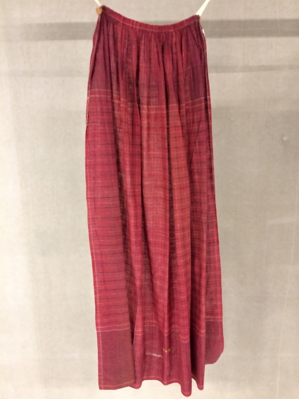 Hindelooper schort van roodbont met geelgroene initialen HR, onderdeel van groep van twee schorten