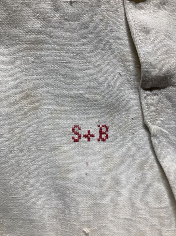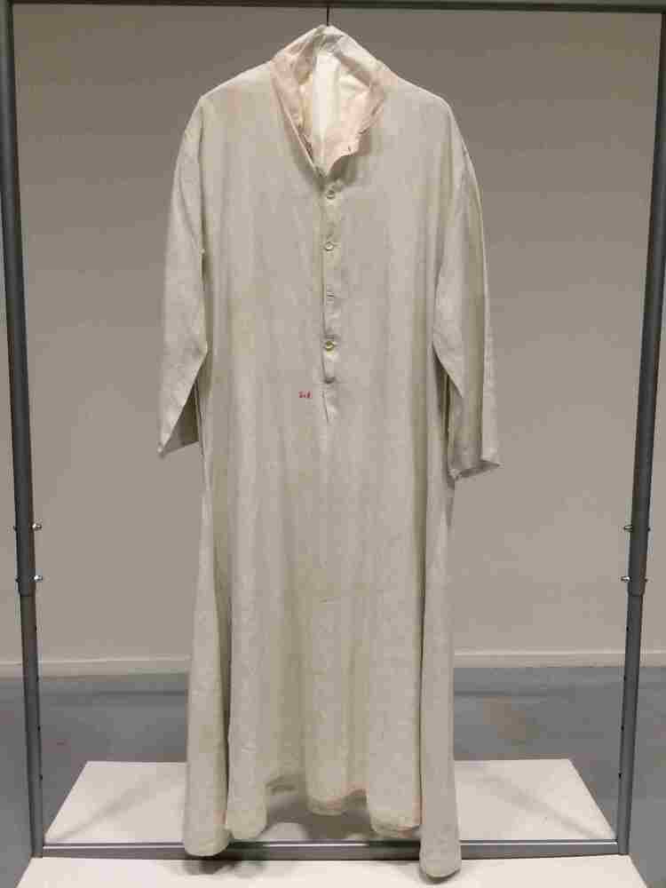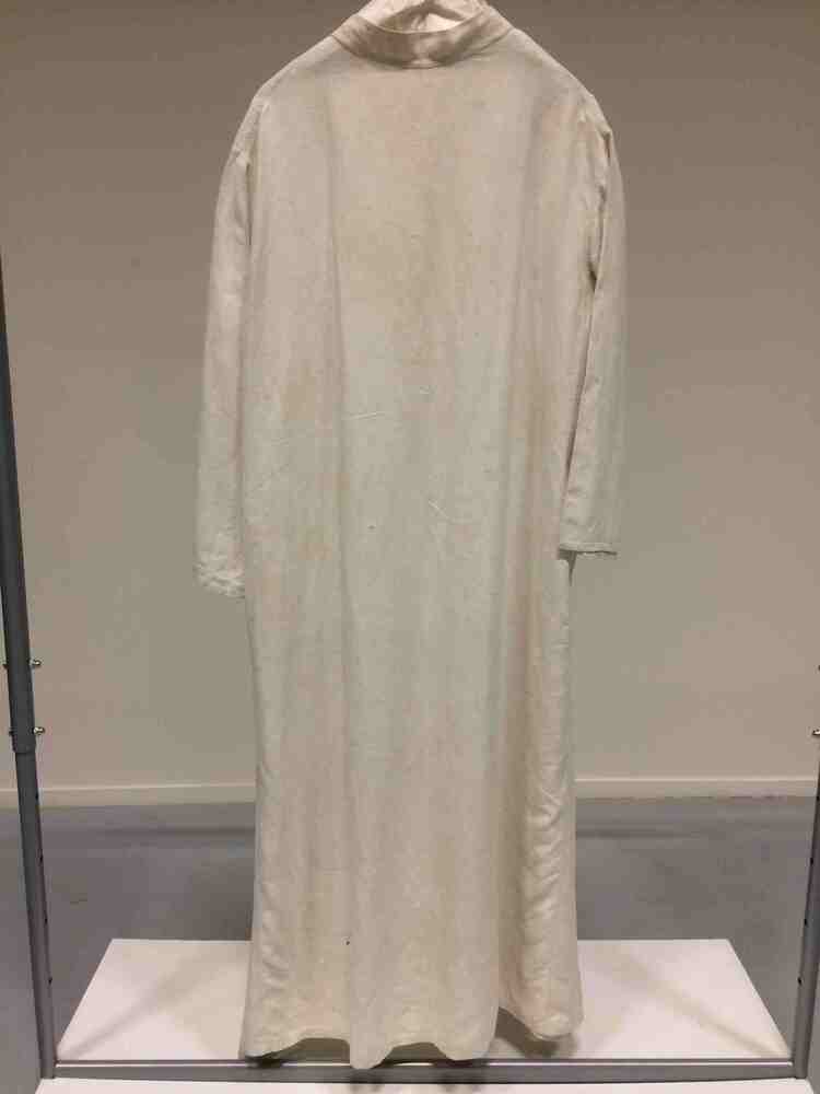 Linnen schilderskiel met lange mouw en groot split met 5 benen knopen, gemerkt: S + B, uit het atelier van Kate Swift en Christoffel Bisschop
