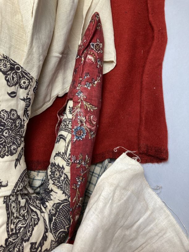 Bedrukte poppebereklauwen met slingerende bloemranken op rode grond