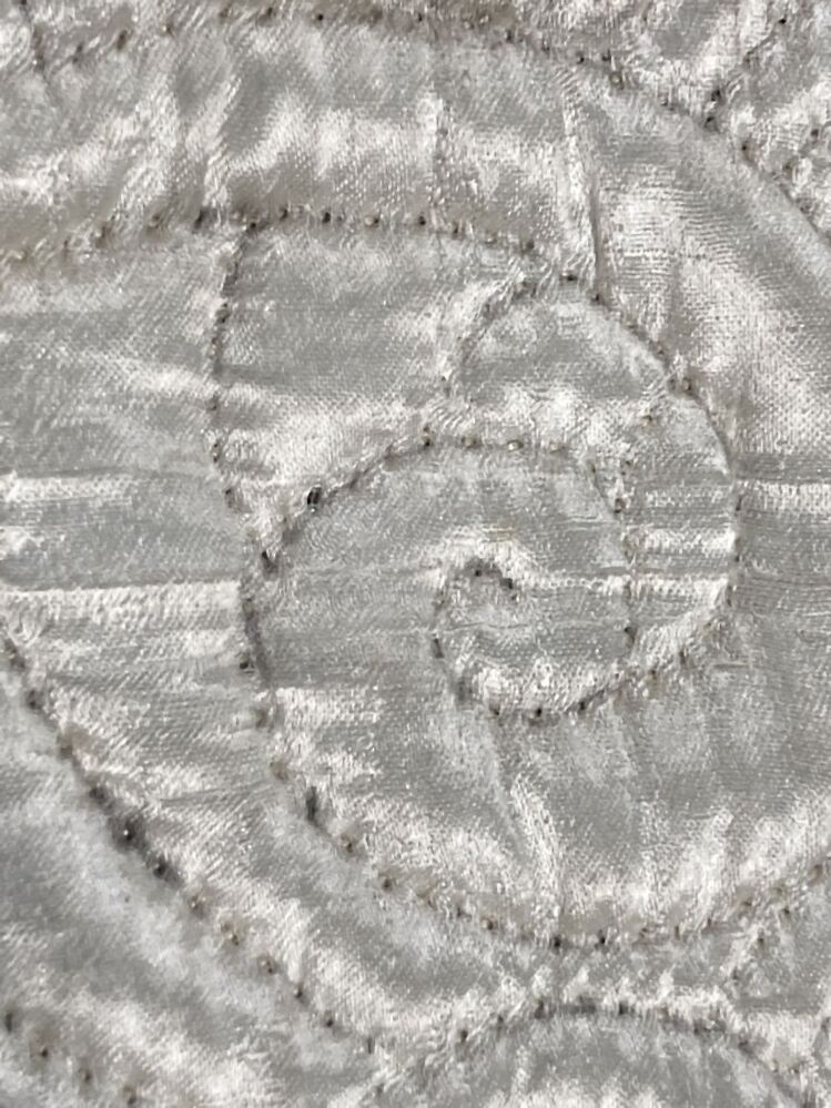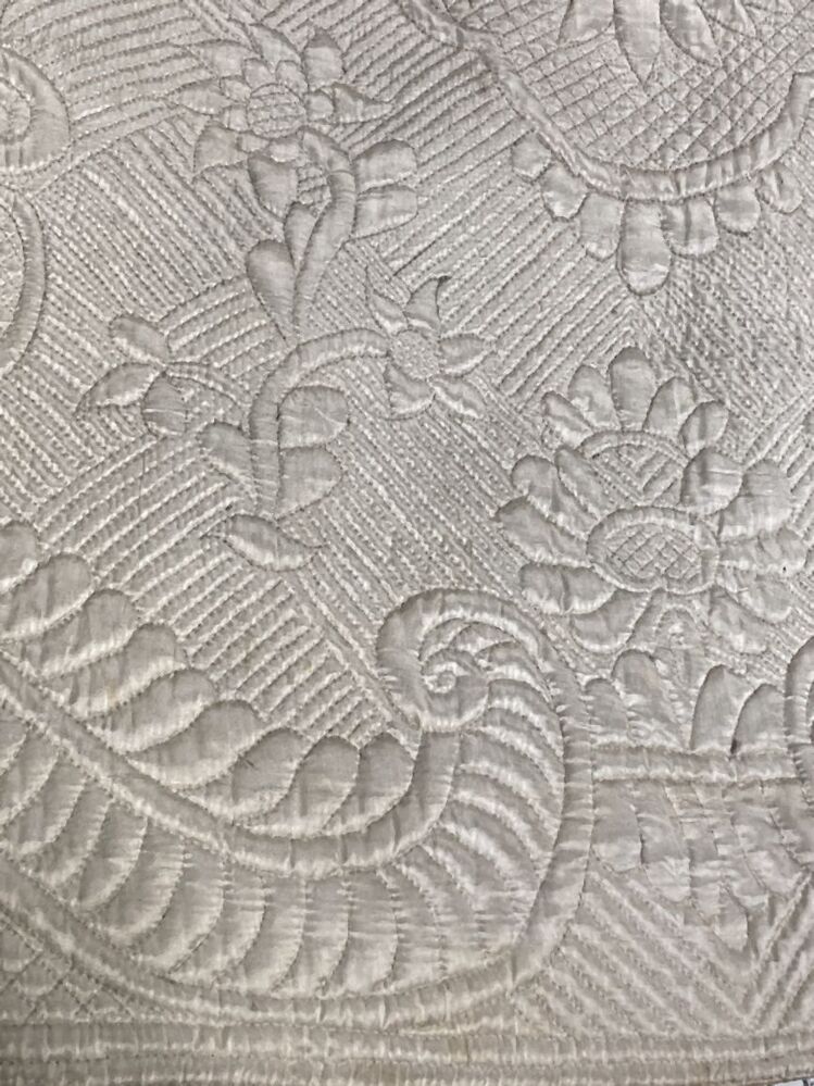 Wijde rok van witte zijde, geheel doorgestikt in floraal motief