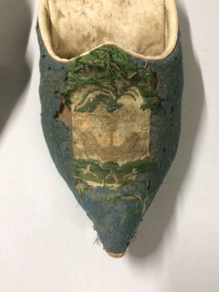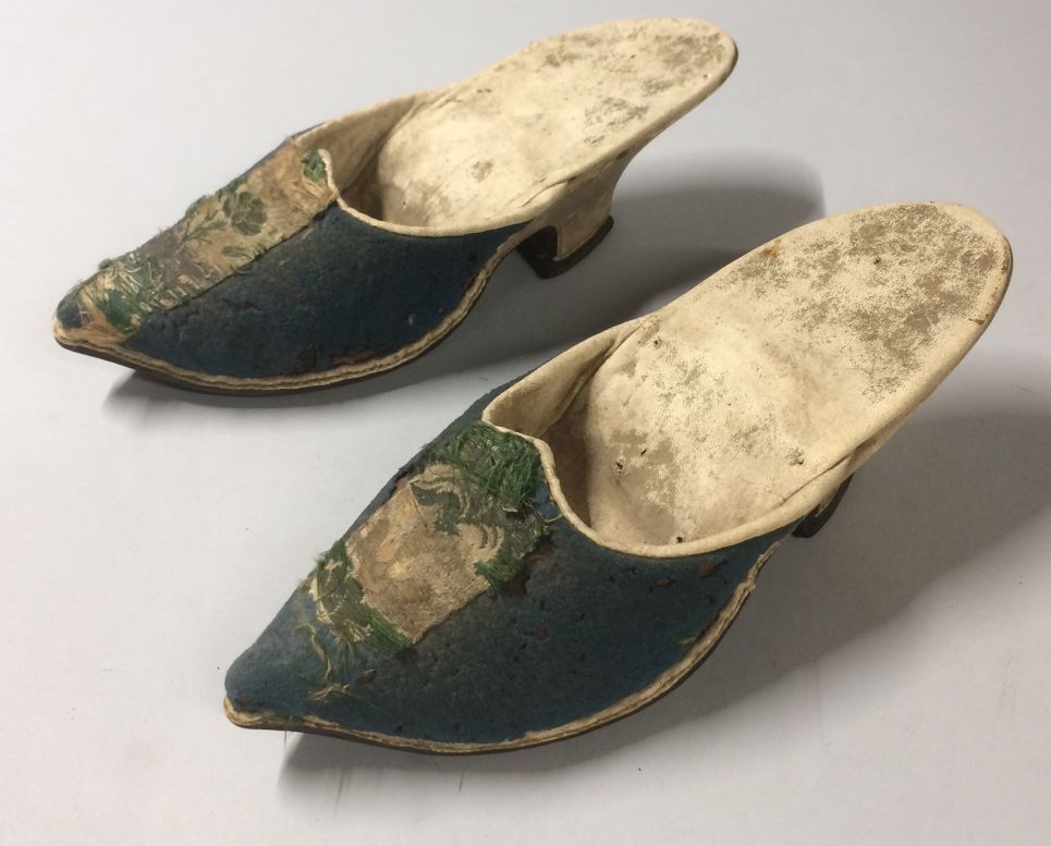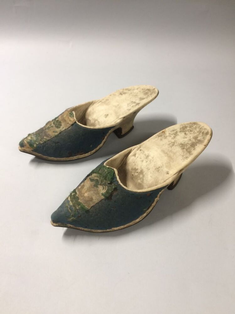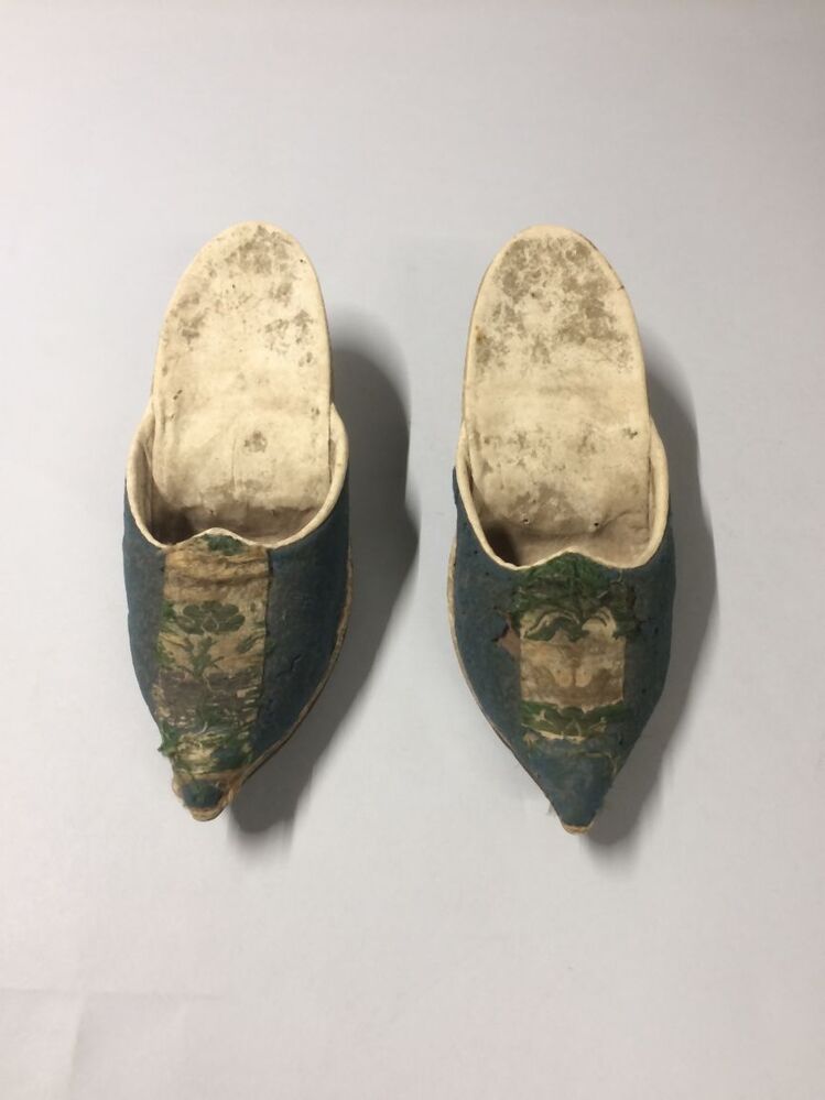 Paar muilen van wit leer, bovenkant bekleed met blauw laken met zijden lint
