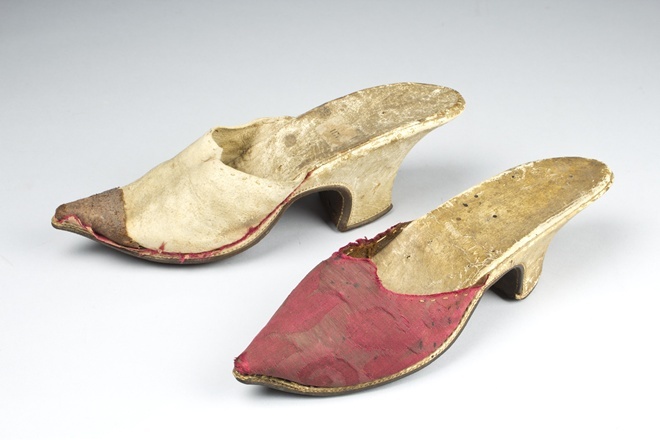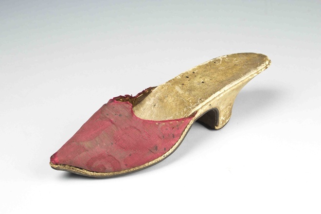 Muiltje van wit leer, bekleed met rood zijden damast