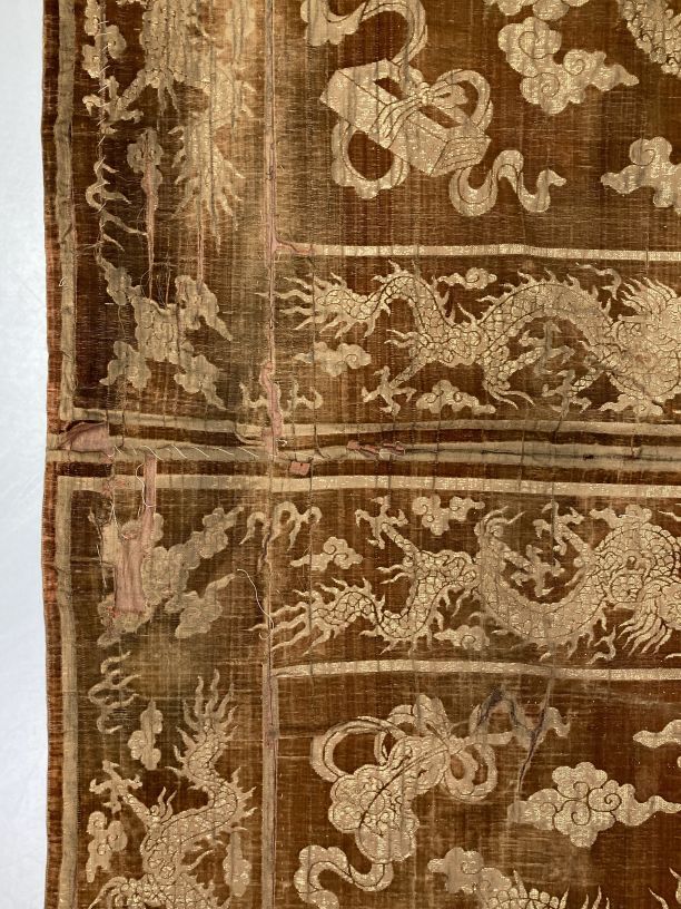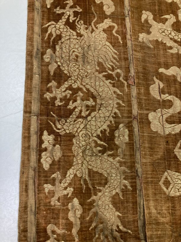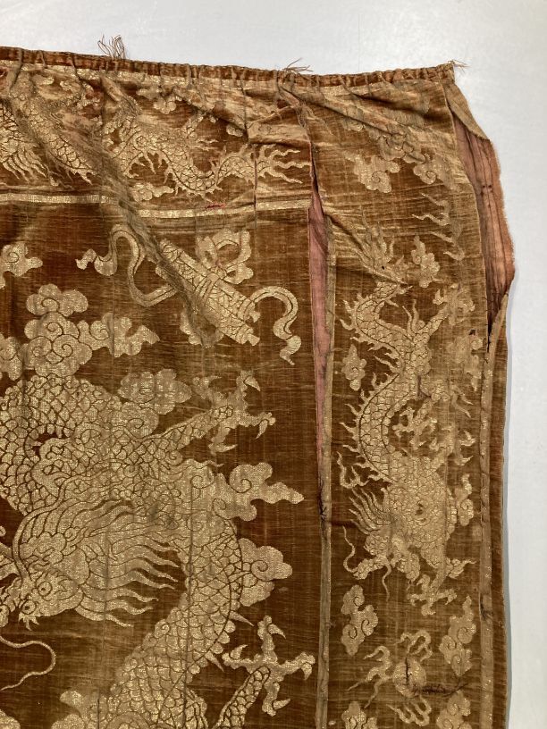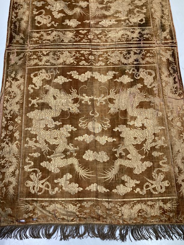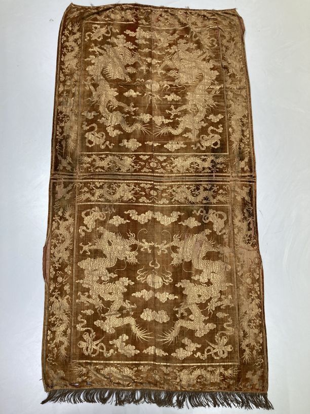 Langwerpige lap van goudgeel fluweel met drakenmotieven in goud geborduurd en zware gouden franje aan de korte zijden