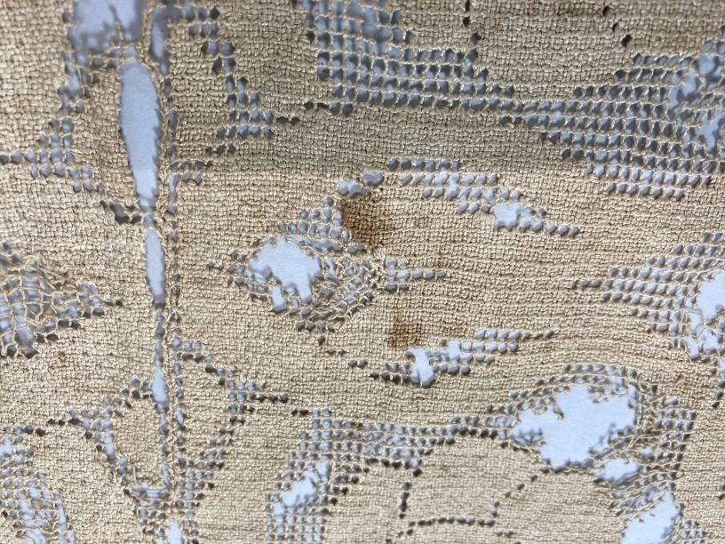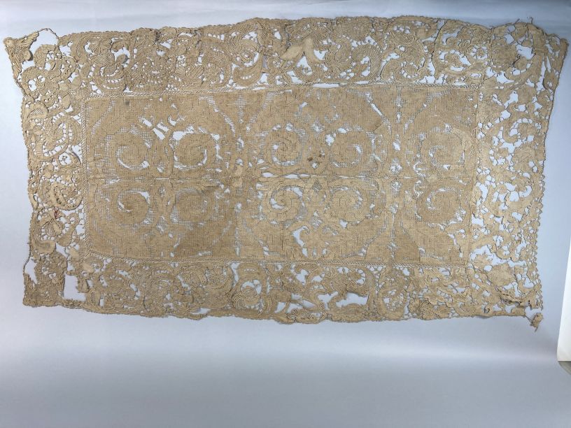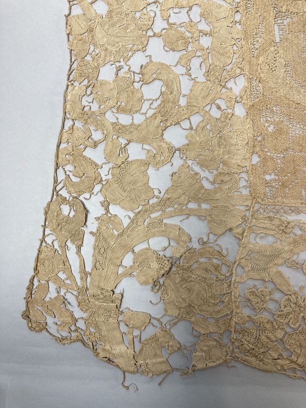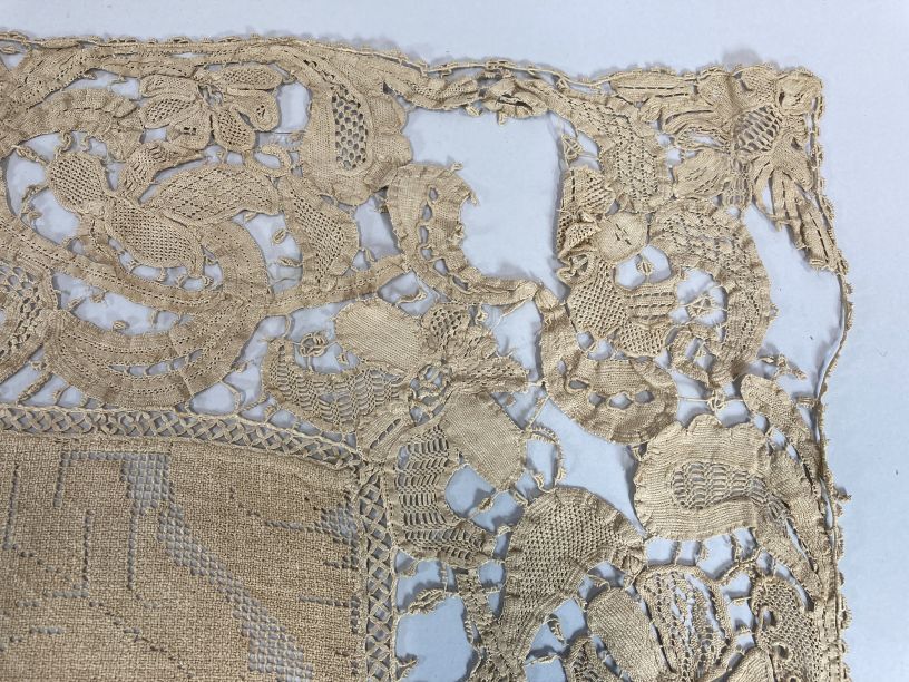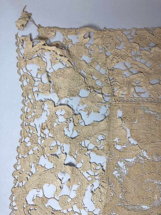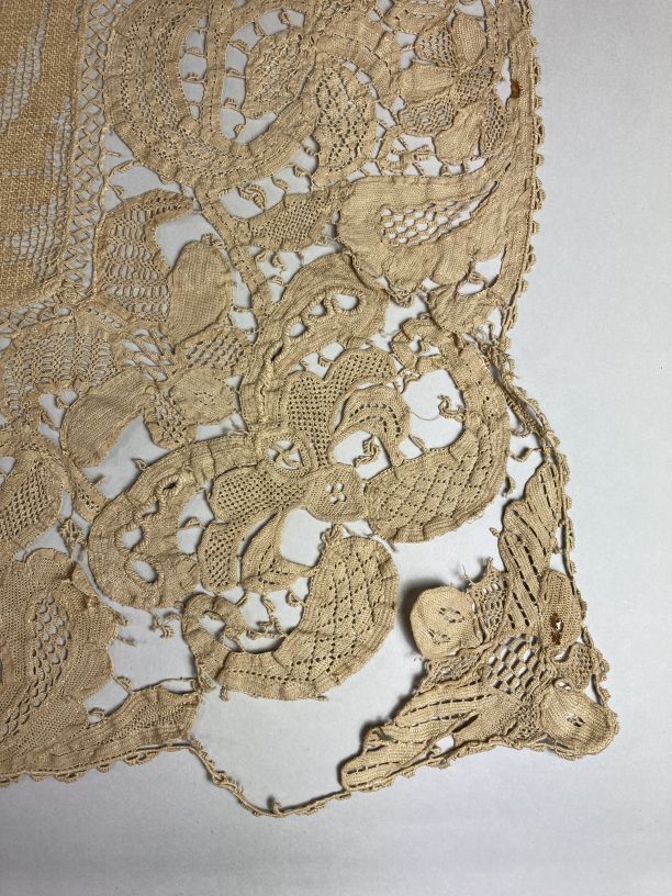 Cremekleurig kleedje met filetknoopwerk en naaldkant, met barokranken, onderdeel van groep van twee